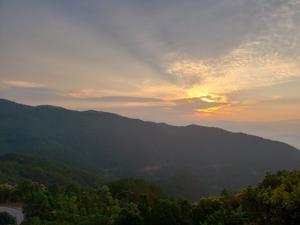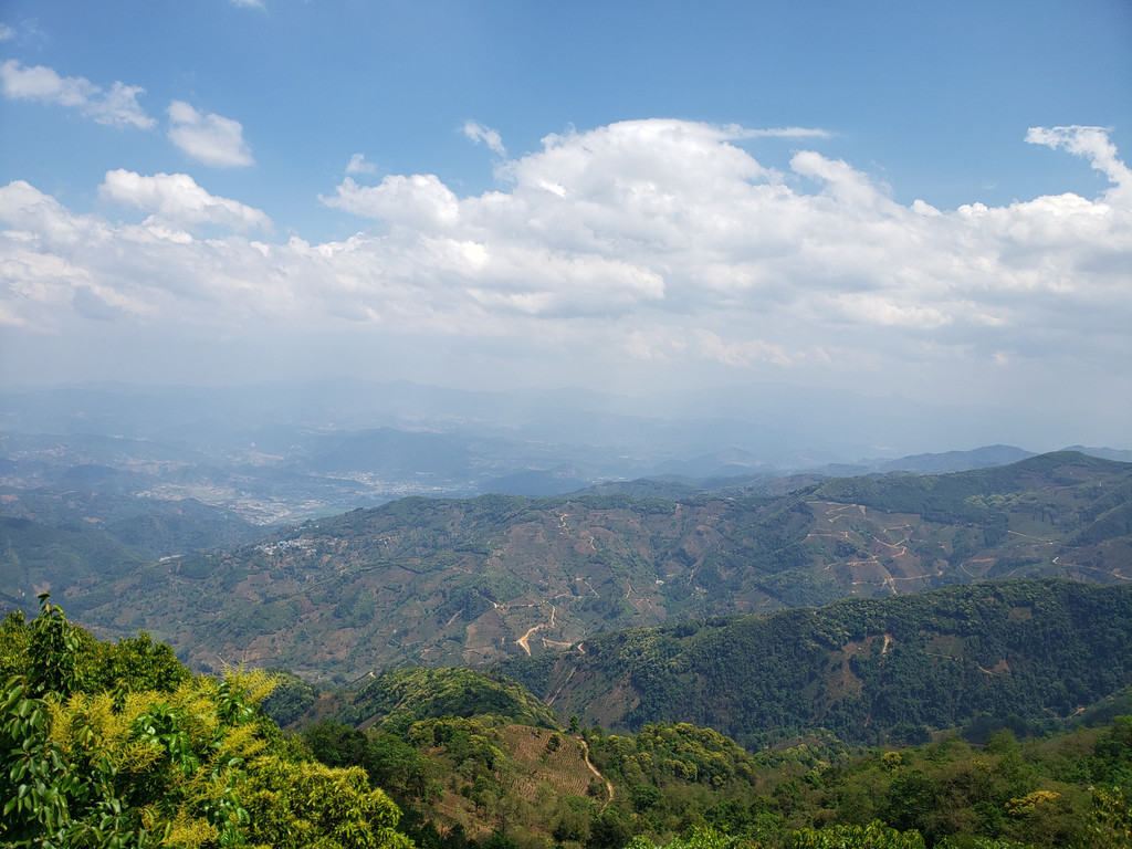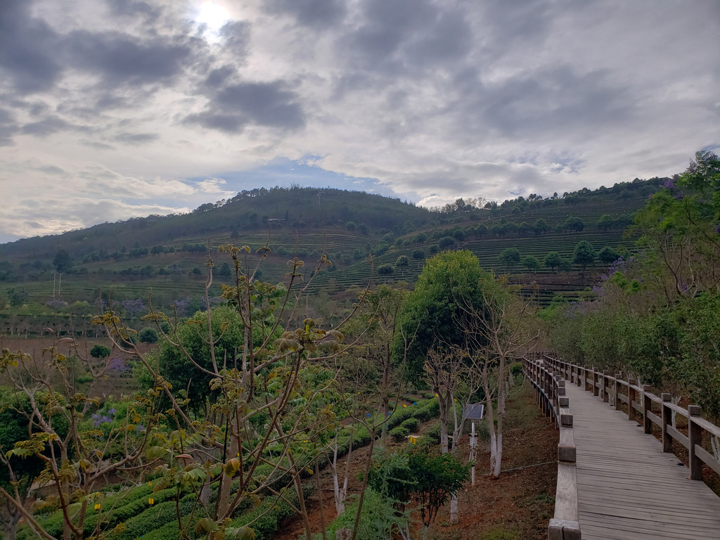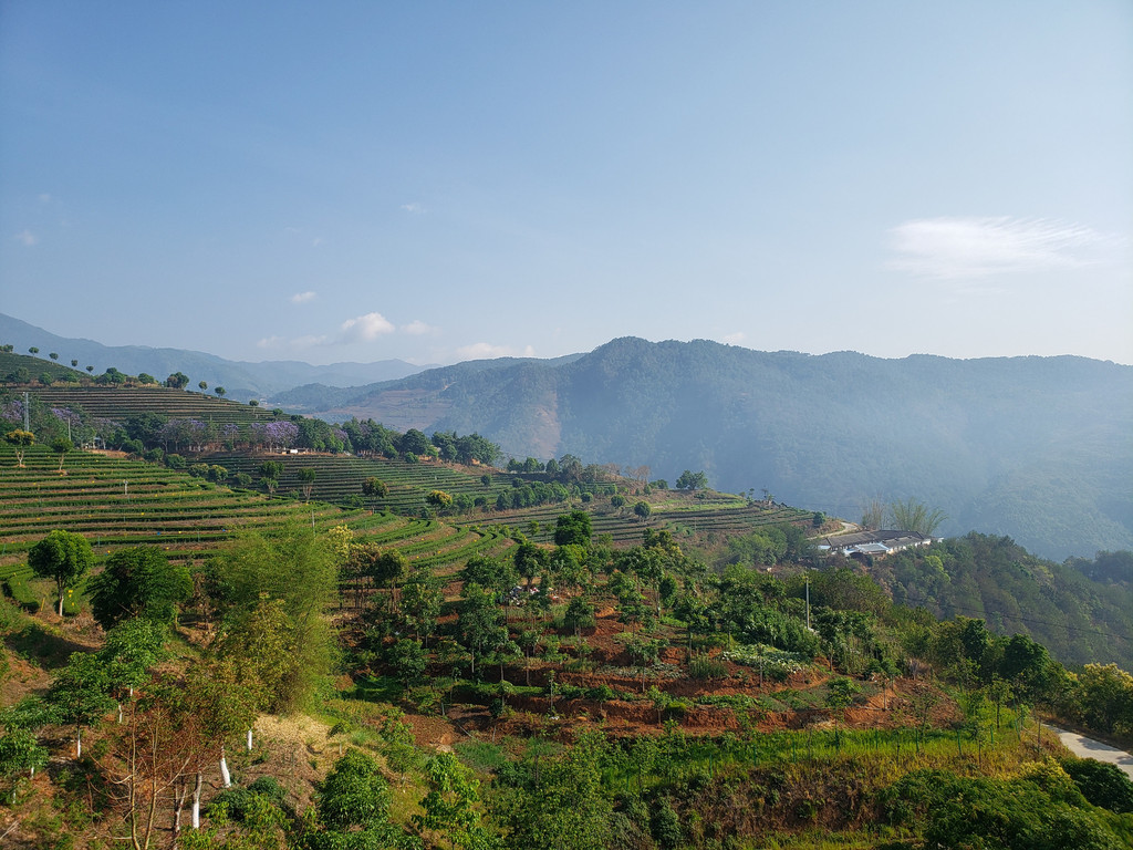 餐中和小伙伴们商议后,决定下午去探访双江万亩野生古茶树园。在经过最后一段20公里左右非铺装路面崎岖的盘山土路后,我们终于到达了位于深山中的茶园。然而茶园并不是一个对外开放的景区,而是一个保护区,经过我们和管理人员一阵软磨硬泡,上交全部火种后,管理人员终于答应我们进入的请求。进入关卡后,继续崎岖的盘山土路,车行不久,到达瞭望塔,要探访到千年的古茶树,还需在原始森林里徒步3公里左右,考虑到安全和体力问题,我们最终决定放弃。那就登上瞭望塔,登高远眺吧,美景如画,也不虚此行。