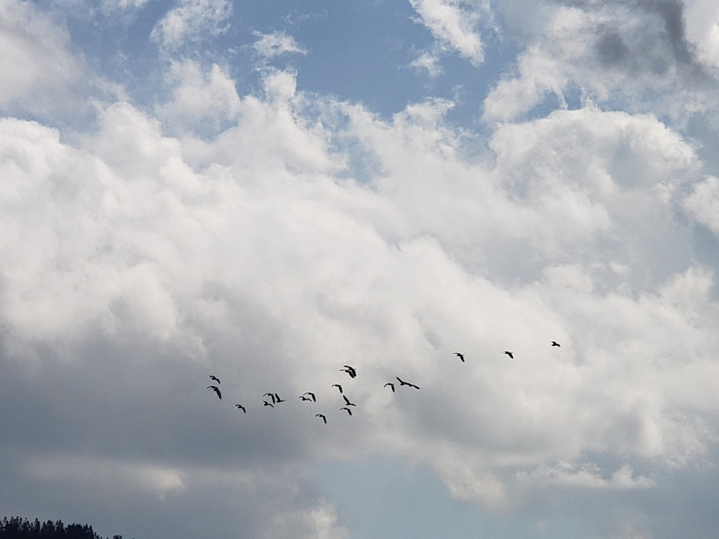 成群的水鸟时而展翅高飞,时而水中嬉戏,一派自然和谐的风光。