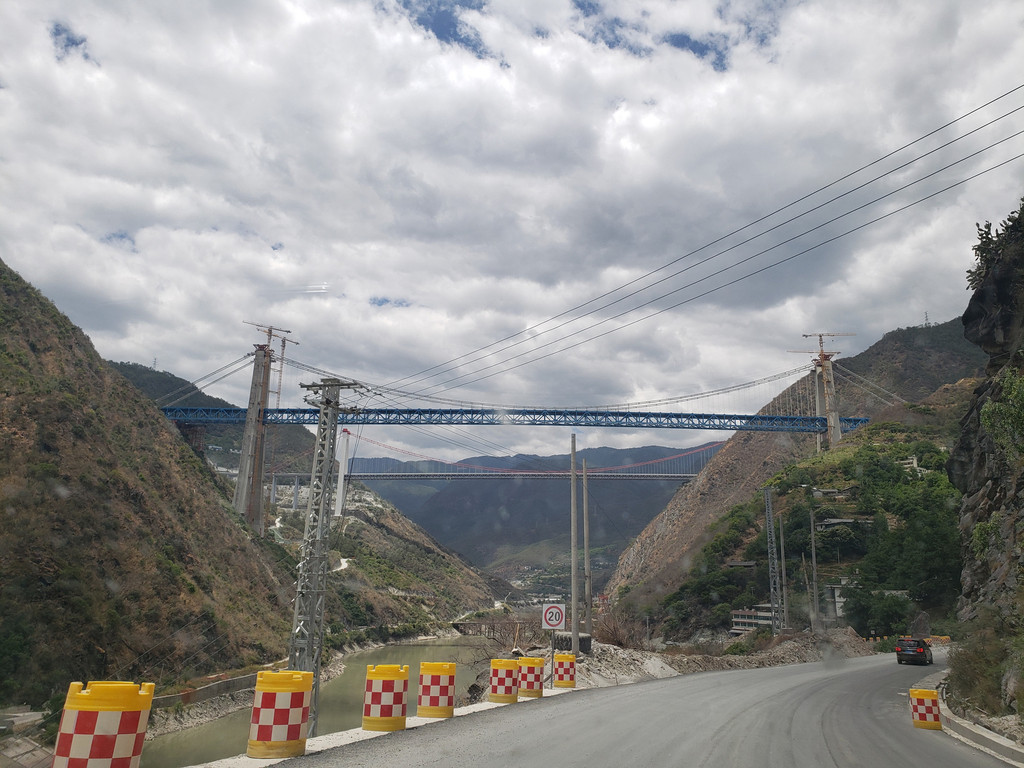 去往大理的途中,两座新建的大桥横跨峡谷,靠前蓝色的是正在建的铁路桥,靠后红色拉索的就是丽香高速公路的金沙江特大桥。