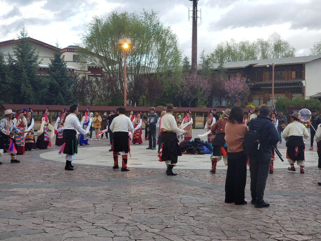 独克宗古城海拔3300米,现在已经是五月中旬,但太阳下山后,寒风阵阵,异常寒冷,早上我们在双廊古镇出发时还穿着短袖,到了这里后换了长袖,外加了冲锋衣还是抵挡不住寒冷,逛了一会,实在顶不住,只能逃回酒店,客房里的地暖太温暖了。广场上不惧严寒、载歌载舞的藏族同胞。