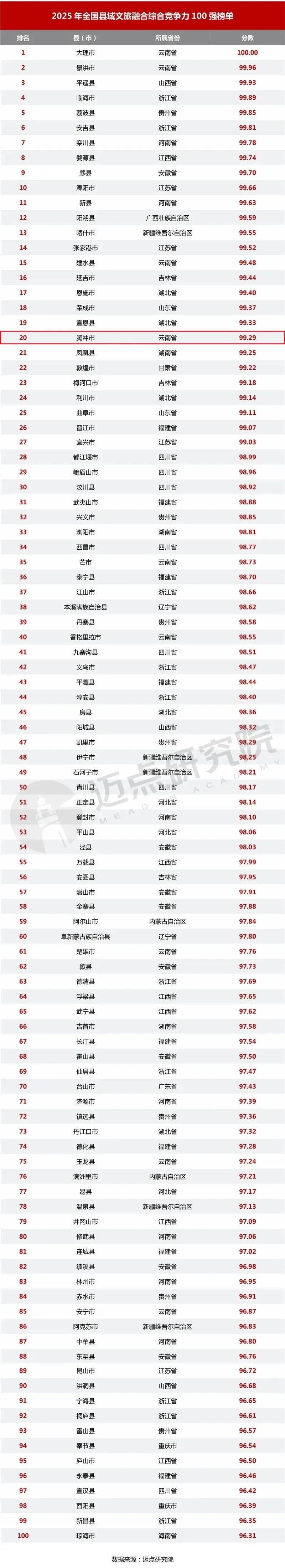 近日,迈点研究院联合新华网客户端发布"2025年全国县域文旅融合综合竞争力100强榜单",腾冲市凭借深厚的文化底蕴、优质的生态资源与创新的融合模式,成功跻身全国百强,成为云南省入围县域中的亮眼代表!这份覆盖全国1869个县域的权威榜单,经过6个月的数据调研与专家评审,用37项核心指标见证了腾冲文旅融合的硬核实力。