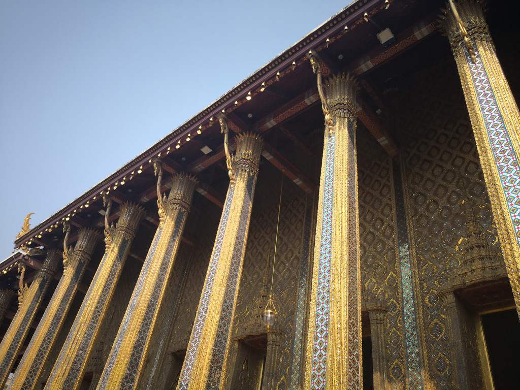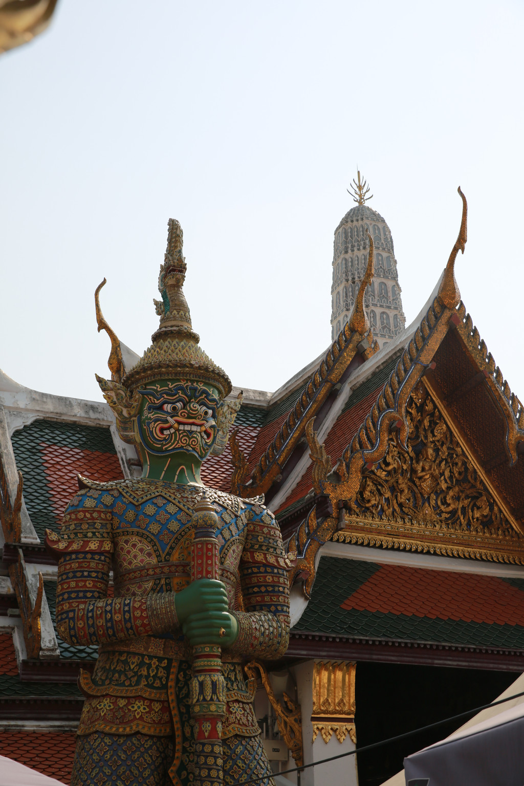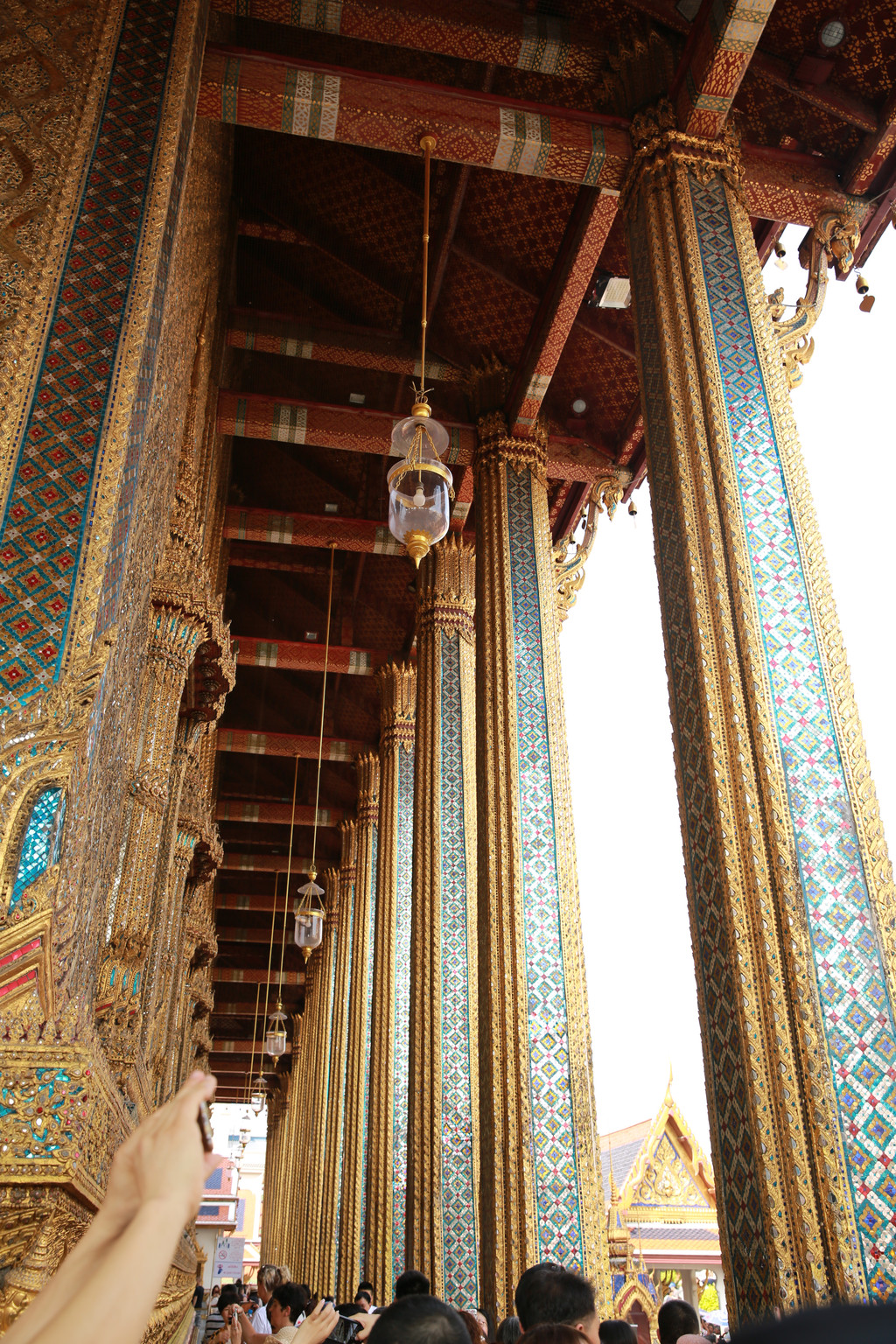 建于1784年,位于大皇宫的东北角,泰国三大国宝之一,也是最著名的佛寺。是泰国佛教最神圣的地方,是查库里王朝的守护寺和护国寺。是泰国大王宫的一部分,因寺内供奉着玉佛而得名。寺内有玉佛殿、先王殿、佛骨殿、藏经阁、钟楼和金塔。要排队进入,而且要拖鞋。寺内不能拍照,有保安维持秩序,观光的游客被搁在线外,只能远远的看,玉佛被放在一个超高的台子上,不带眼镜真的看不清。