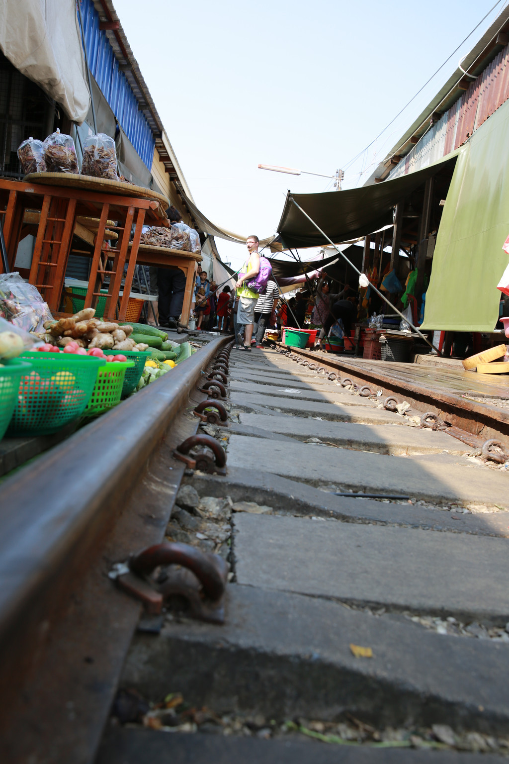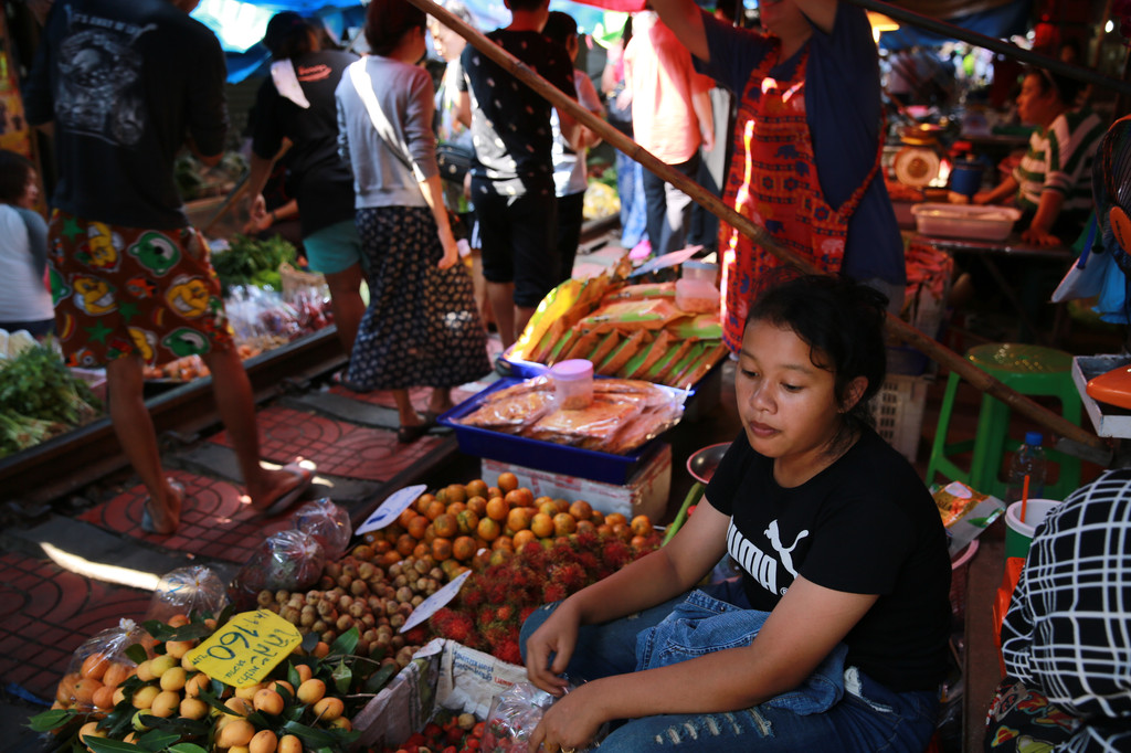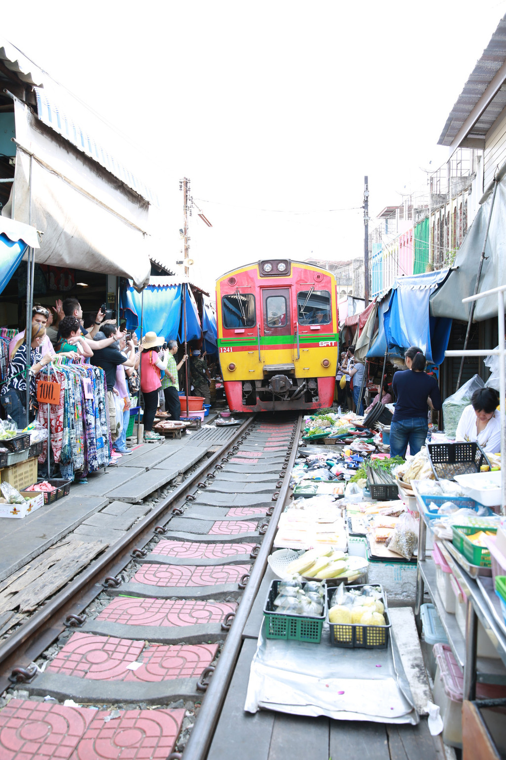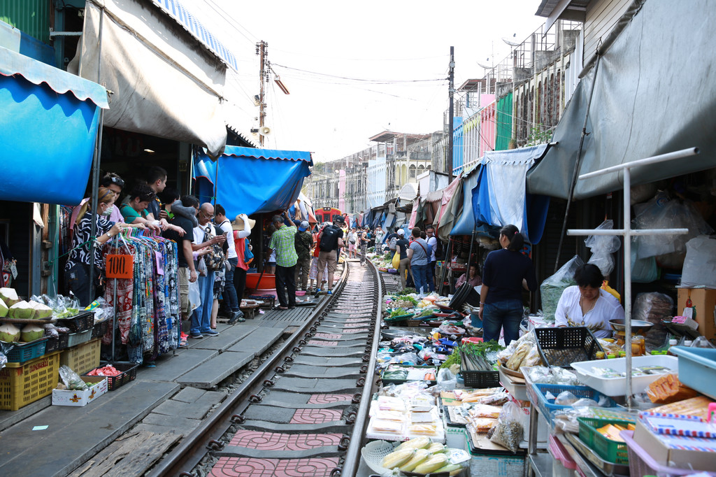 泰国著名的美功铁道市场(Maeklong Railway Market)。泰国的丹能沙都水上市场和安帕瓦水上市场的时候,很多人一定会在夜宫府的美功镇下车。是美功小镇的一个毫不起眼的菜市场,这里是当地人们购买海鲜、蔬菜、水果等食品的一个小菜市场。但是,因为美功火车站往曼谷方向去的火车会穿过的这个宽度不足2、3米的菜市场,场面十分惊险,于是美功菜市场被人们当做了一个旅游景点,凡是去泰国的游客,都会慕名前往去欣赏。