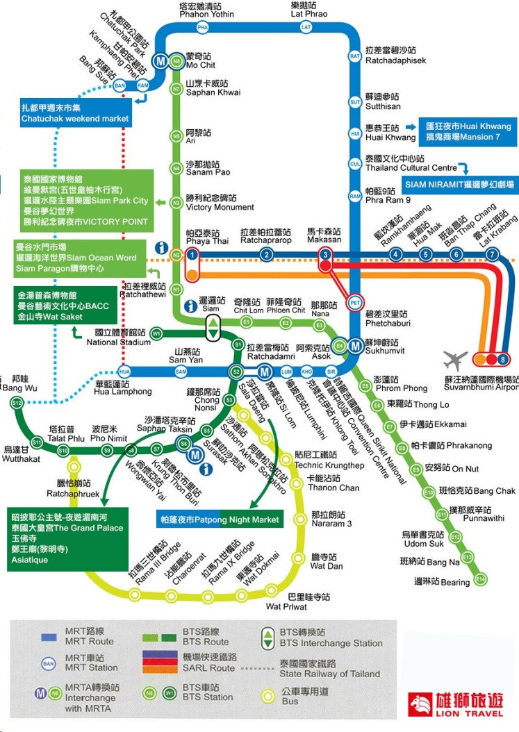 ①轻轨BTS (Bangkok Mass Transit System Skytrain)指示牌非常清晰,在国内做过轻轨/地铁的,完全可以搞定。共两条线路Silom Line和Sukhumvit Line可站内换乘的。适合一日购物游。