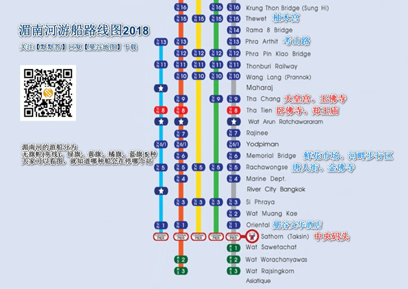 ③湄南河游船 (Chao Phraya Express Boat昭披耶河) 有5条航线在运行,分为五种船,Local Line(当地人坐的,每站都停) 、Orange Flag Boat(船头有橙色旗帜)、Green Flag Boat(船头有绿色旗帜)、Yellow Flag Boat(船头有黄色色旗帜)和Chaophraya tourist boat(蓝色旗帜),区别是停靠站不同、运营时间不同(基本到晚上19:00左右)。