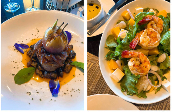 从新鲜干搭配泰北格辣肠佐百香果酱开胃菜、牛排、帕玛火腿、普吉菠萝酱鲜虾沙拉、法式鹅肝搭配泰国鲜柚沙拉、香煎排搭配普吉格封肉到香煎鸭肉义大利面,每一道都非常用心,主厨不仅把?菜融合了泰国的菜色,更使用普吉当地产的菠萝制成搭配沙拉的酱汁,非常清爽开胃,让游客也能尝到来自当地的自然食材。