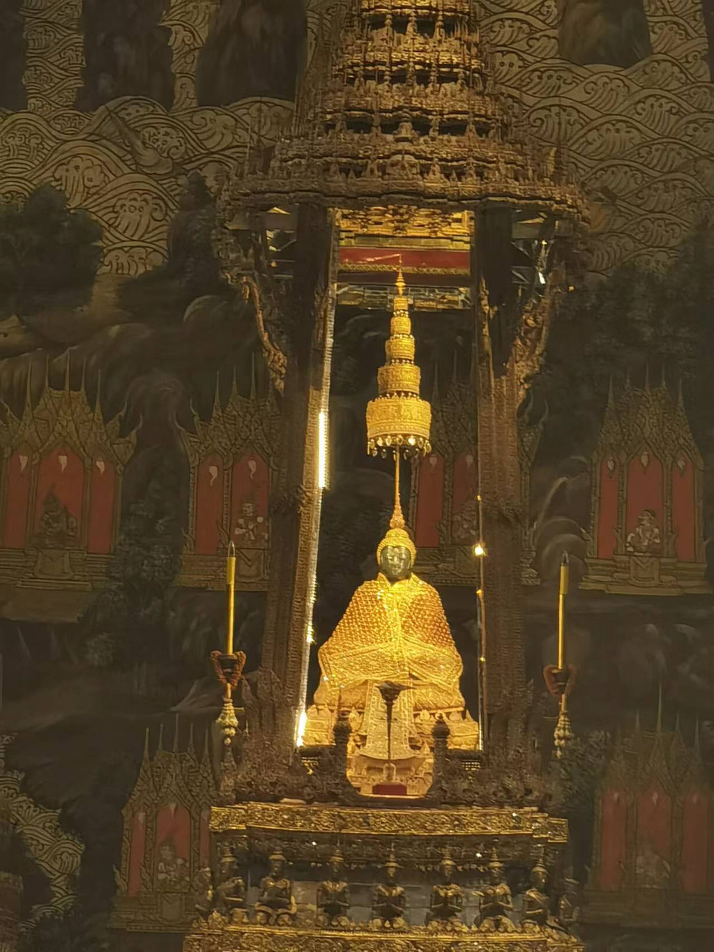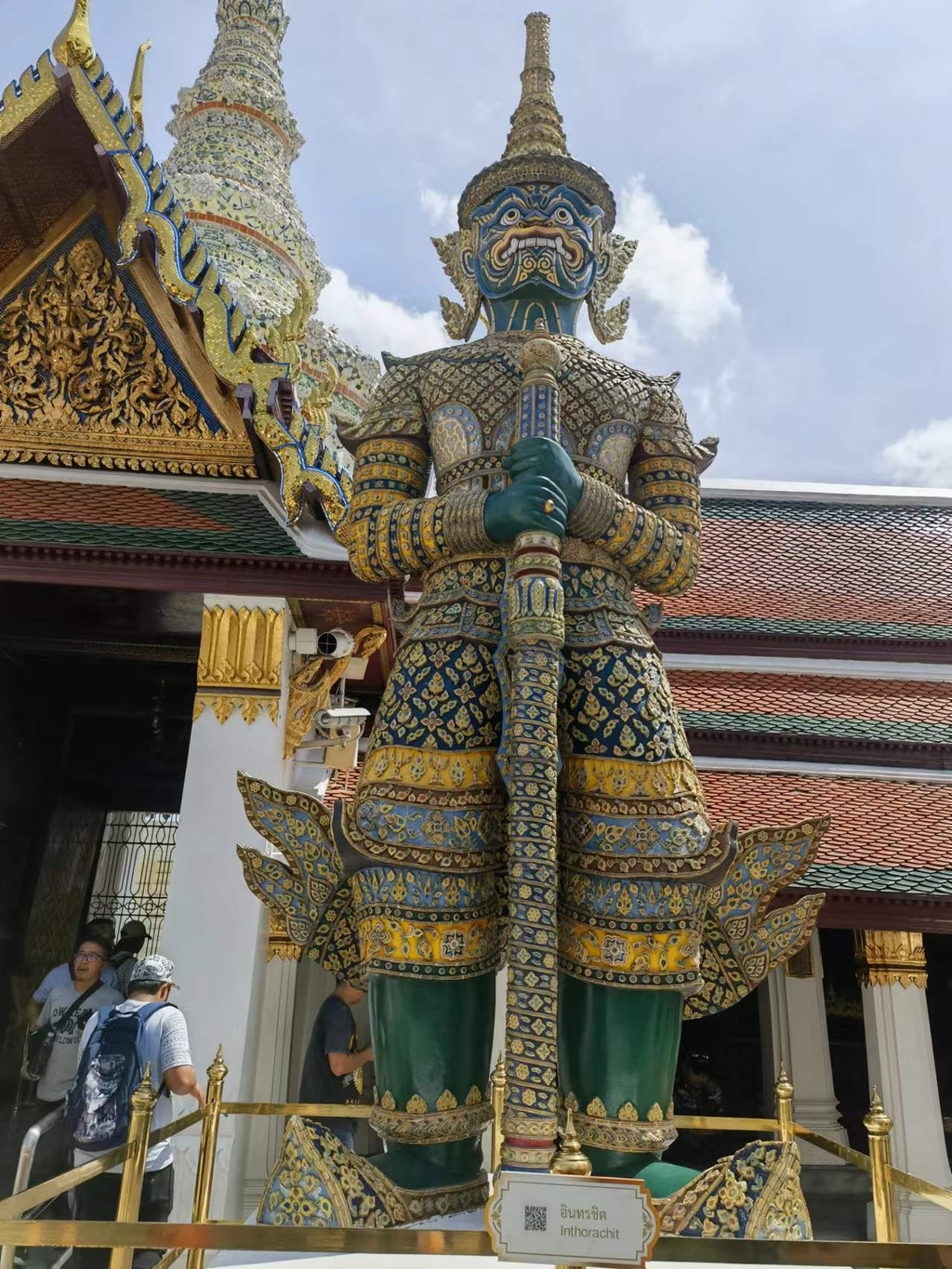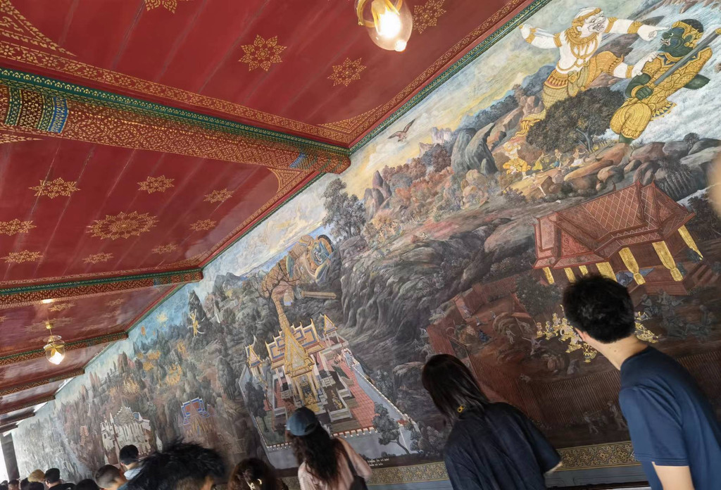有两个事值得一提,玉佛寺的围墙内侧一圈全是壁画,这个壁画在暹粒吴哥窟的墙上也有,金边的柬埔寨国家博物馆也有相关的故事,都是源自印度的一个历史传说。泰国王室象征的建筑里,搞一些印度神话故事,不知道咋想的。