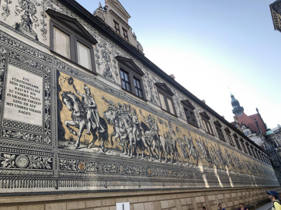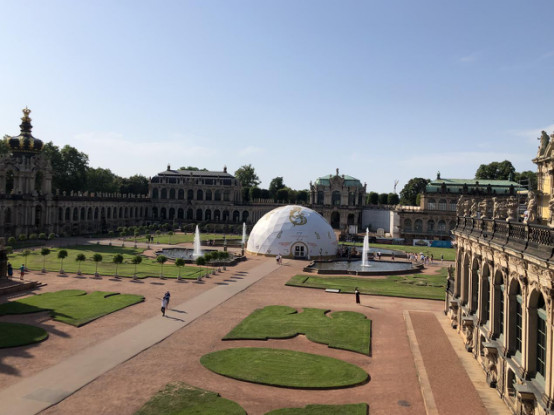 茨温格宫(Zwinger),开放时间10:00~18:00,路线:穿过“玩偶报时钟亭”(Glockenspielpavillon)进入中心庭院,从庭院中央建筑处的阶梯可登上宫殿建筑的二楼平台,这一带是出名的部分墙亭(Wallpavillon),庭院二楼向下可以俯瞰纽普仙女池(Nymphenbad),茨温格宫左侧翼的中央是王冠门(Crown Gate),门顶是守护波兰的天使雕像,右侧翼是规模庞大的塞姆佩尔画廊(Semper Gallery)。茨温格宫有6家博物馆,最值得一看的是古典大师画廊(Galerie Alte Meister),最著名的藏品是拉斐尔的《西斯廷的圣母像》和意大利吉奥乔尼的《入睡的维纳斯》,此外还有伦勃朗、维米尔、普桑、丢勒等大师的作品。此外还有军械库(Armory,德语Rustkammer)和数学及物理沙龙厅(Mathematical-Physical Salon)以及瓷器收藏馆(Porzelansammlung),可惜我们参观完绿穹博物馆去到那里已经闭馆了。
