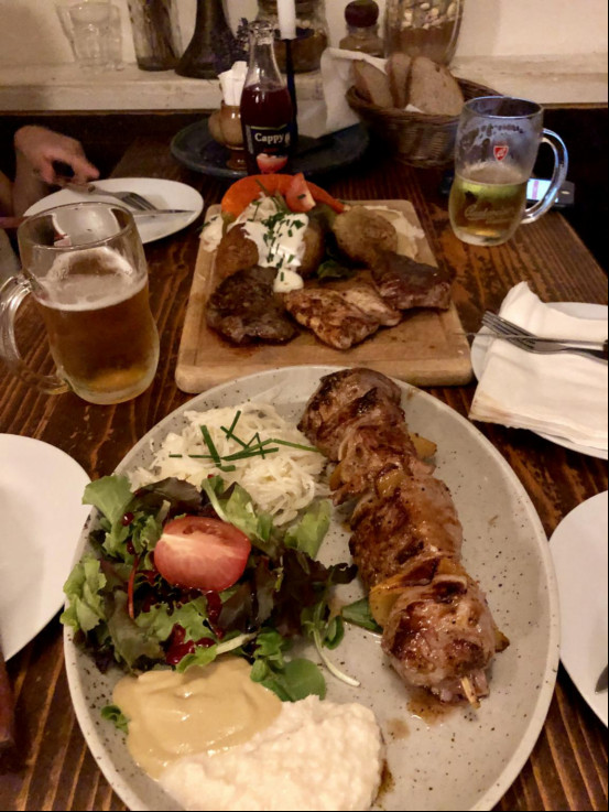 中午吃饭的洞穴餐厅(Krcma v satlavske ulici)(从中心广场东北角的Mastal Restaurant前方转进Satlavska小巷,餐厅就在巷子尽头的右手边)特色菜:烤猪膝、烤排骨、面包洋葱汤(Garlic Soup in Bread),感觉时行程中最好吃的一家餐厅。