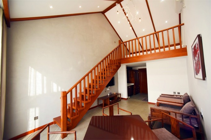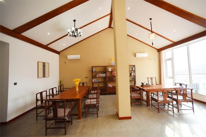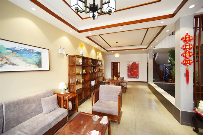 loft中式客房能容纳4-5人,一层是休闲娱乐区,客房内并配有中式沙发,茶具,麻将机。原本的空间以中式风格为主,但是为了提供游客方便入住,让现代和些许新古典元素也容纳了进来,满足家庭各个成员的需要。