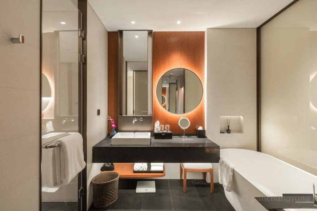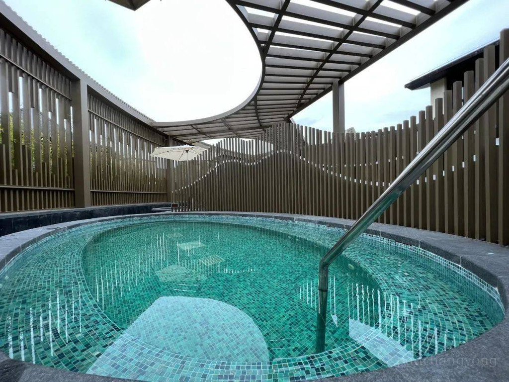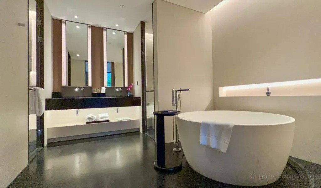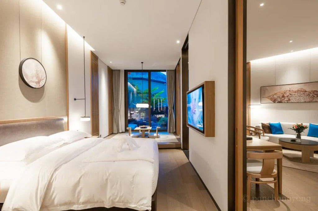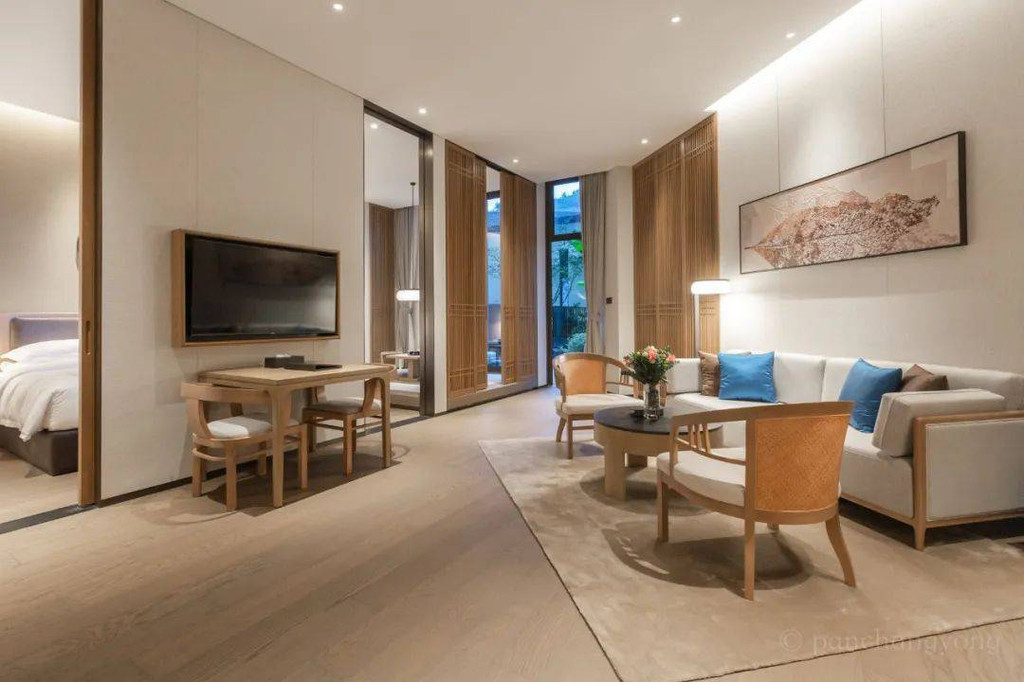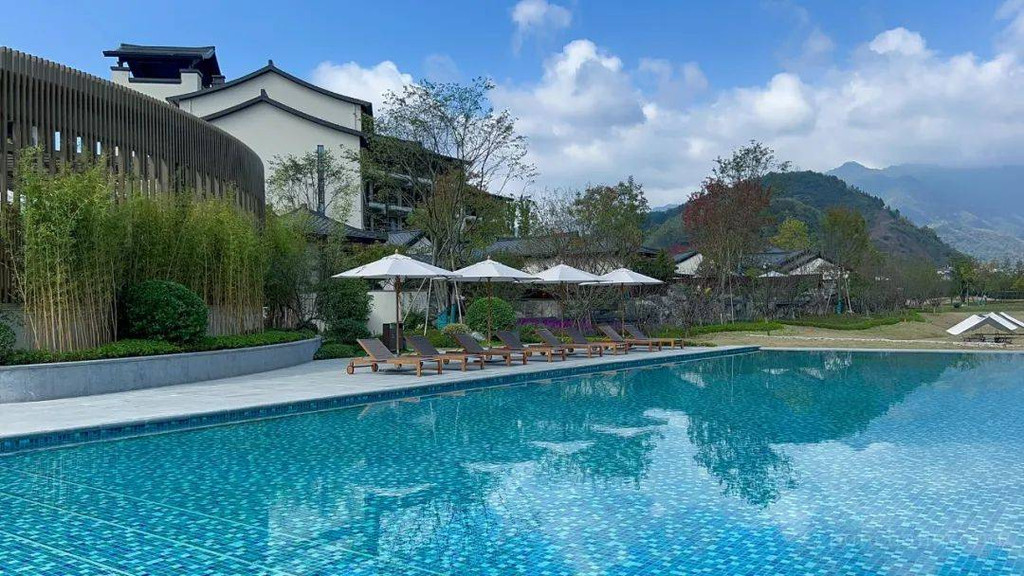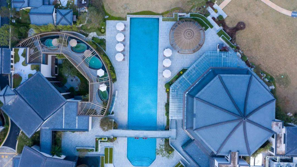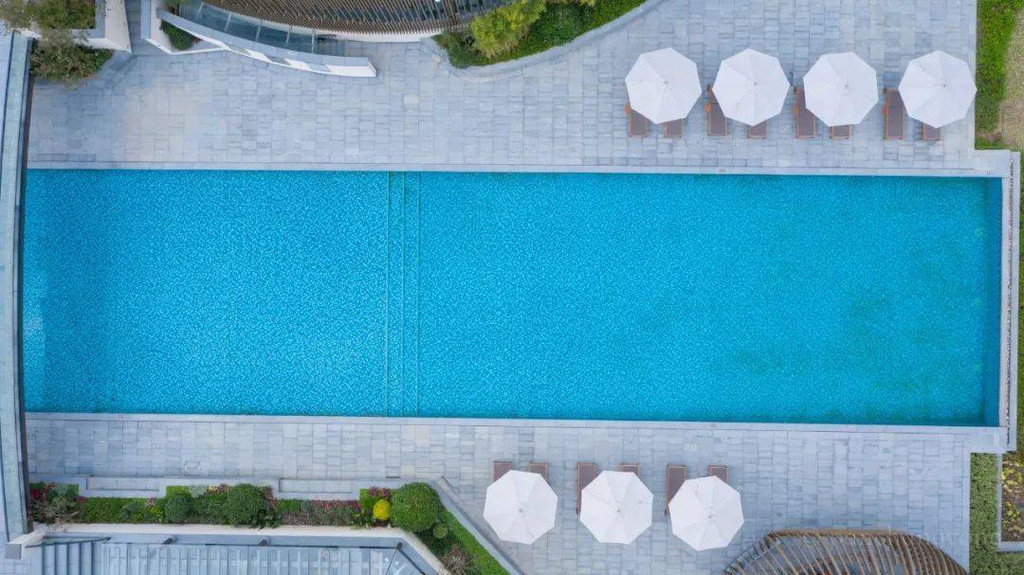 特设的泰悦雅颐养生中心,包含热香薰池、室外泳池、健身房和以中式和泰式理疗为灵感的轻奢娜泰水疗。而酒店的户外池水呈现碧蓝色,木质躺椅也有着浓郁的度假感。