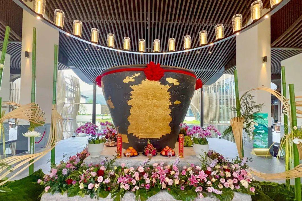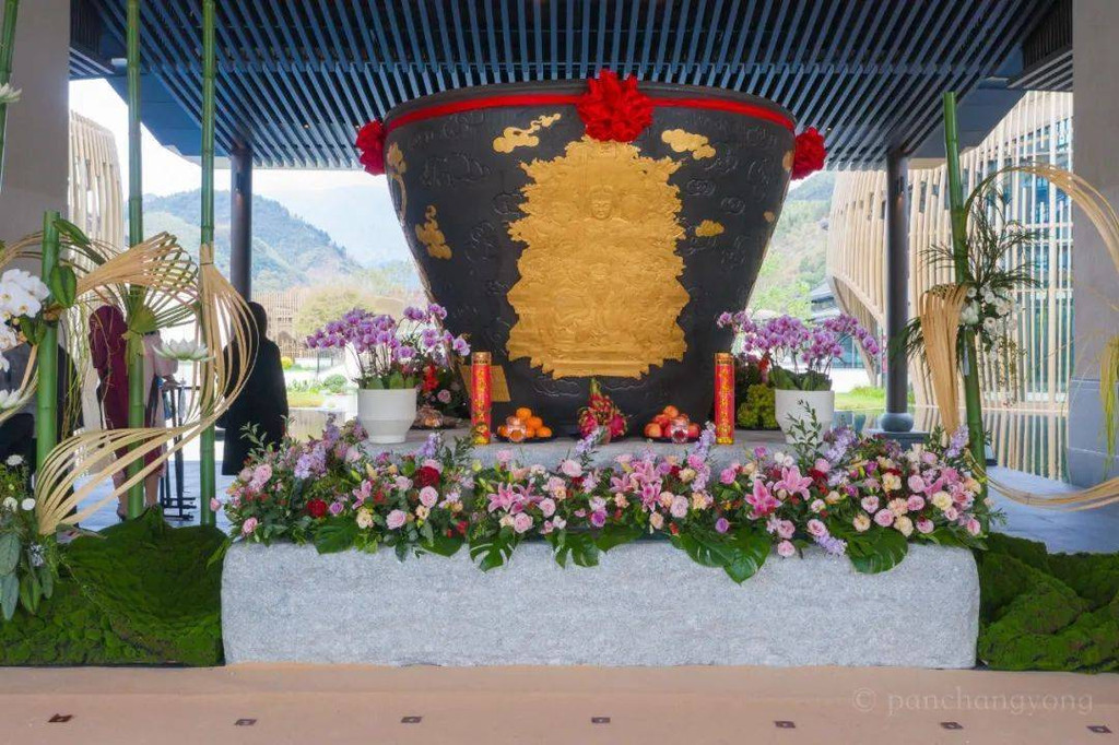 摆放在酒店到达落客区的是获得世界吉尼斯纪录的“韦陀天目盏”瓷土成型、黑色底釉高温烧制,盏壁韦陀苦萨浮雕纯金工艺装饰,前后耗时3年完成。始于唐朝,盛行于宋朝的“天目盏”的绝世风采,制盏所用陶泥全部来自天目山数十里范围内,复原当时天目窑瓷传统复杂的工艺流程。