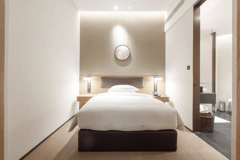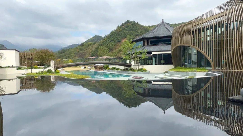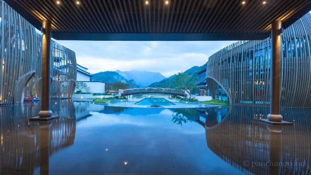 比如落客区的「韦陀天目盏」,在大堂的水景前远眺天目山上云雾缭绕,户外泳池,以及横跨泳池上的廊桥,总让宾客忍不住拿起手机来拍照打卡。