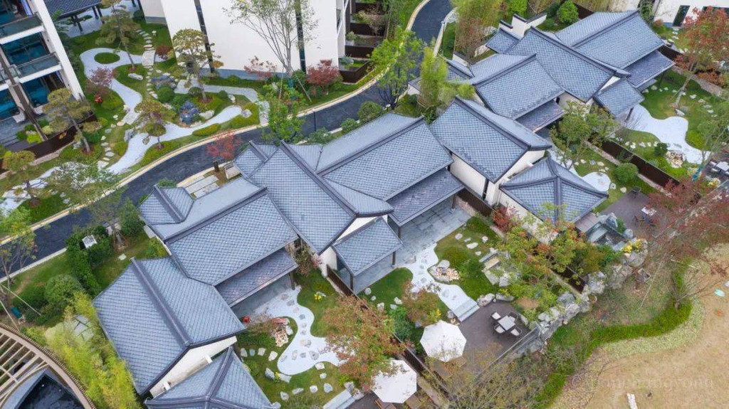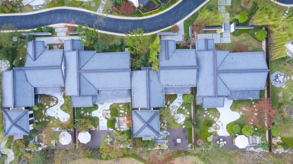 航拍酒店,能看到酒店独特的歇山式房顶、鱼鳞状的陶瓷片与泰国传统的兰纳式建筑融入在山林之间。白墙灰瓦,俯拍看别墅区域的小庭院,还真是度假最惬意的歇息所在。