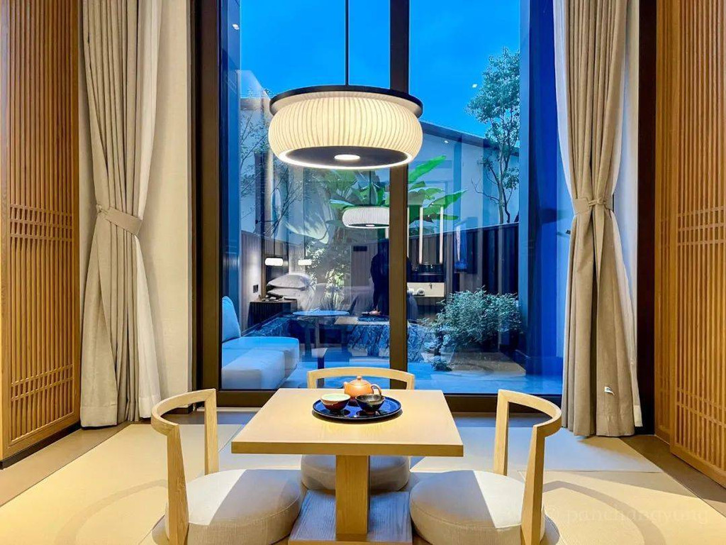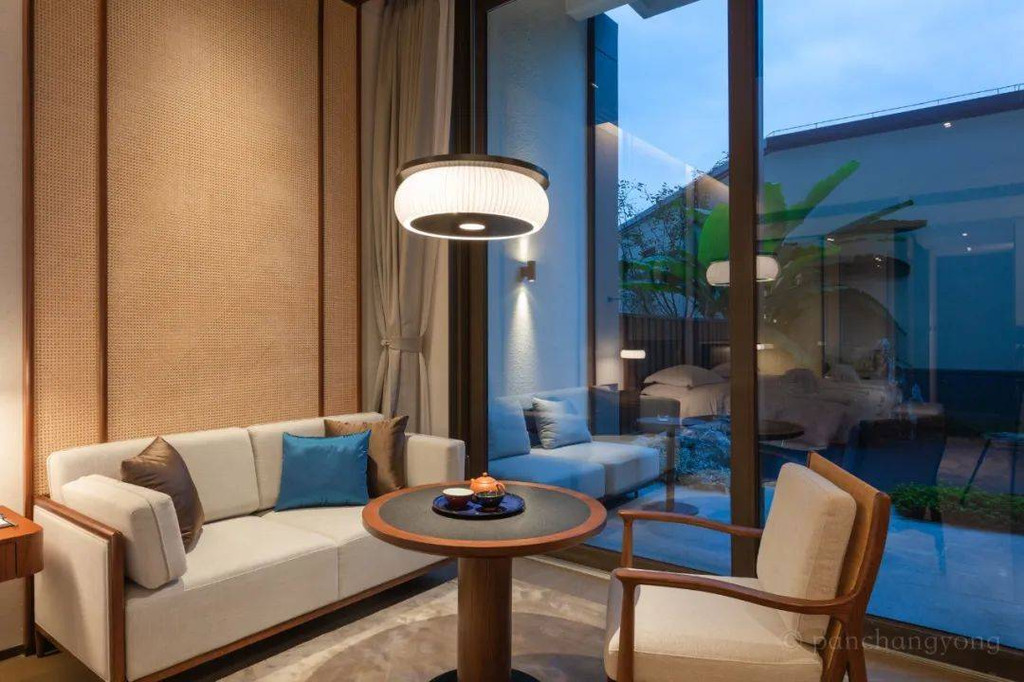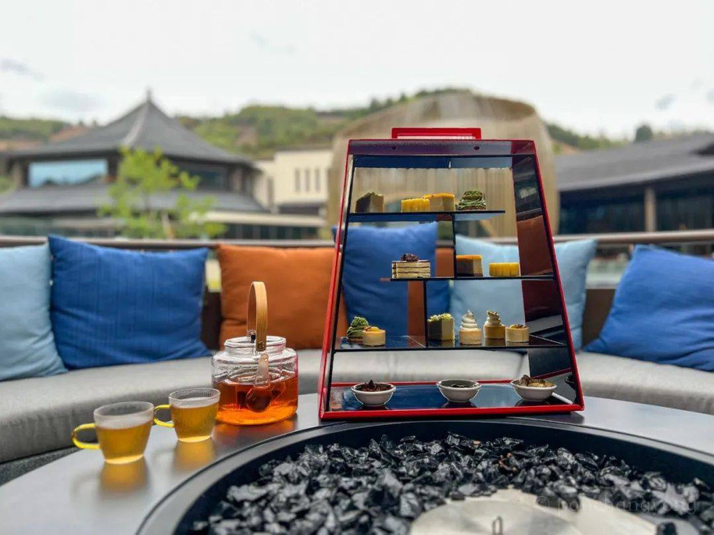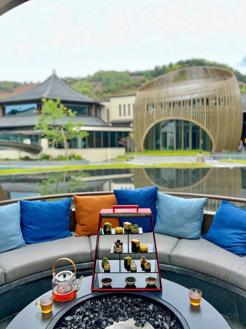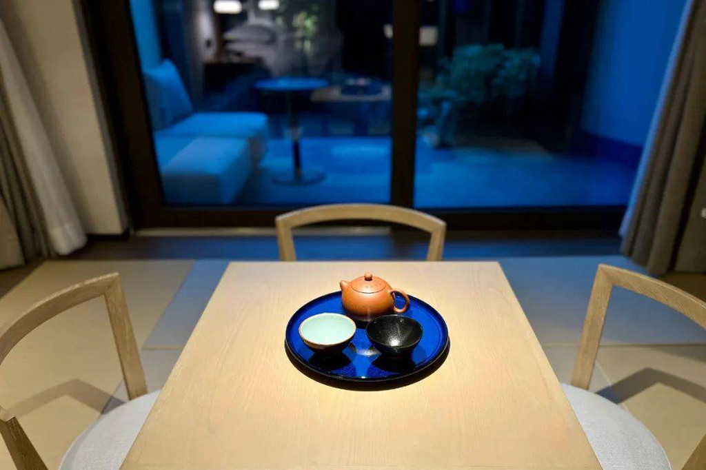 客房内还会配备传承非遗工艺复刻的天目盏茶具,躺在阳台用天目盏泡上一壶茶,体会一把隐入山林、避世而居的怡然。