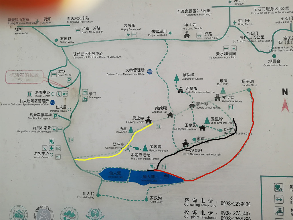 上飞崖灵应寺那带,三条路都可以上,一条是黄线标示的,就是上面仙人崖景区大石碑的左手边上去,第二条是从石碑的右手边走,到湖边后走南崖方向,也就是黑线标示的,三是过桥从湖边走,前面二条路上山比较累,第三条路一直是平路,到了山底,再爬很陡的大概100多级台阶(当时数了后忘了),上去后到几个寺院都是平路了。