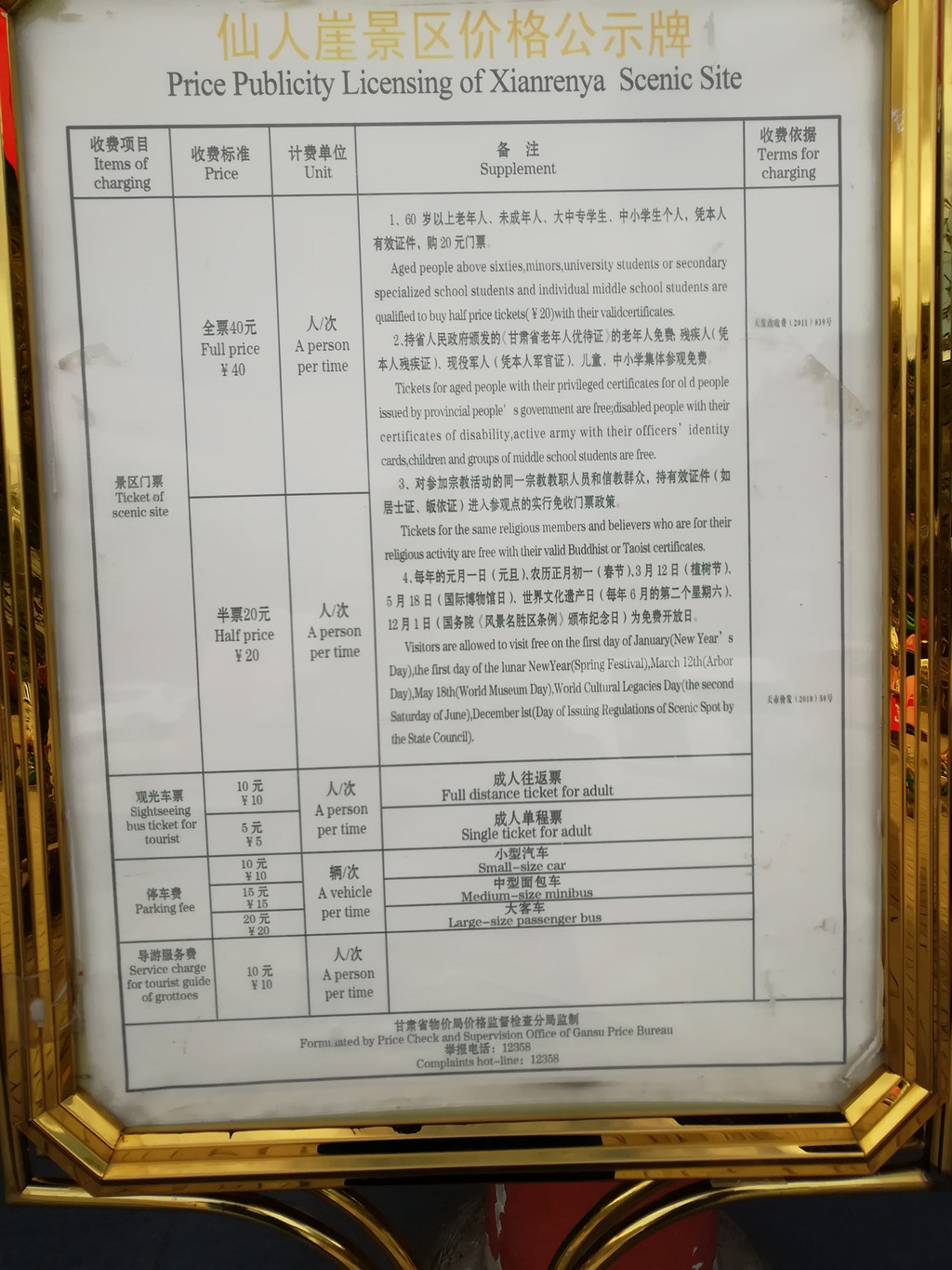 仙人崖景区价格公示牌