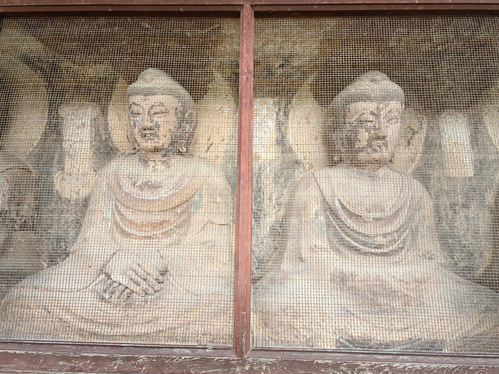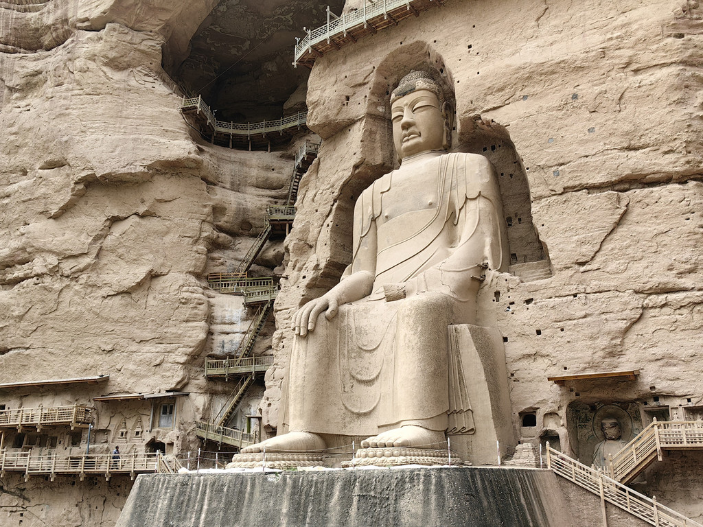 在陡峭的崖壁上有浮雕3尊,中间的大佛高达40余米,两旁是手持莲花躬身肃立的胁侍菩萨。佛坐莲台上,莲瓣间层刻有狮、鹿、象,或站或卧,排列对称,雕琢古朴,形象生动,造型艺术水平较高。周围诸多佛龛伫立着宋代小佛像。崖面上部向前突出,又加筑风檐以蔽风雨,檐端雕刻飞云走兽,悬挂铜铃,微风过处,叮铛作响。其造型留有小乘佛教的痕迹,在我国石窟艺术中实属罕见,是研究我国早期石窟文化的重要资料。