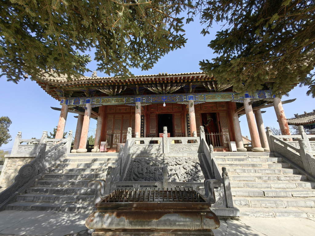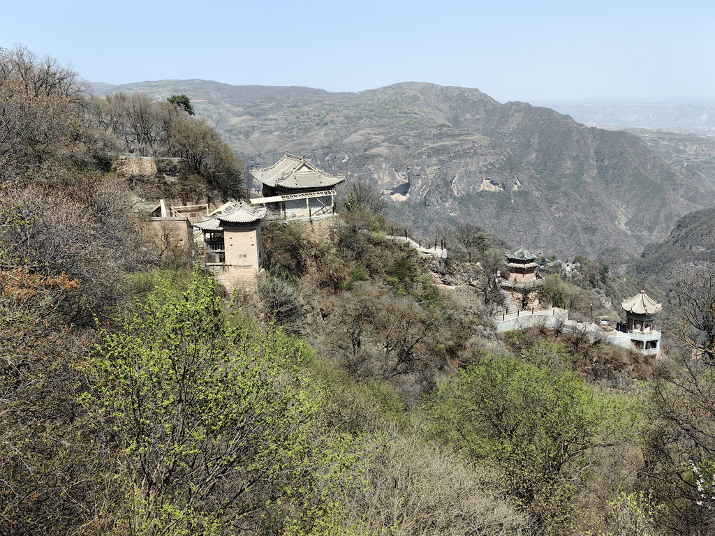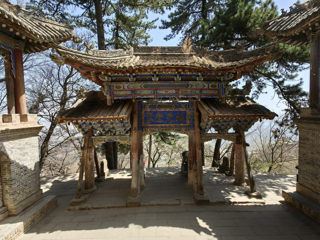 沿石阶继续下行到达中台,沿途经过许多大大小小的殿宇。每一建筑单元在峰、峦、坡、崖、涧的不同位置上,借助于自然景观的雄伟高大或奇峭幽深,就地取势,构造出不论单体或整体上独有的仙山琼阁的幽远意境。