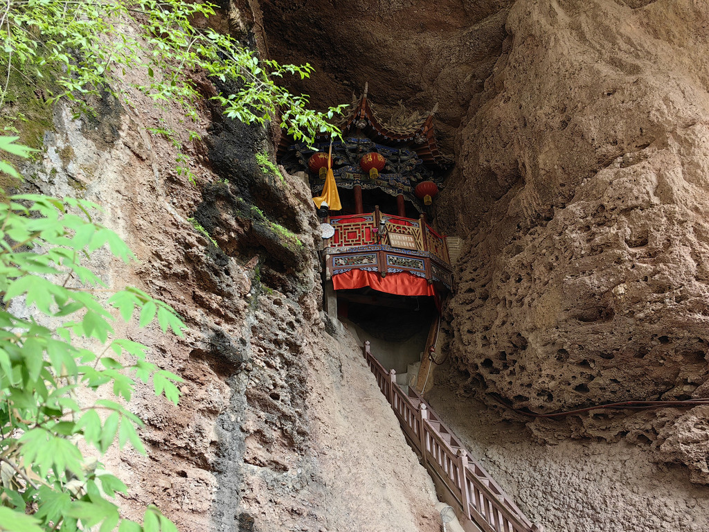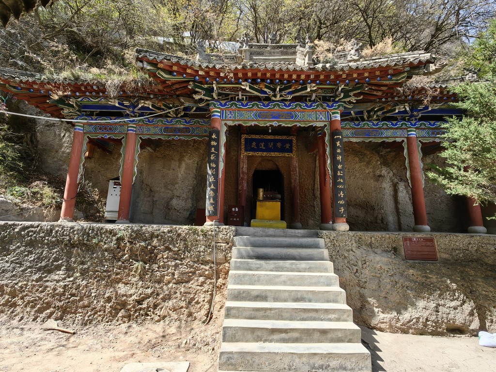 沿石阶前行,皇城的右侧下方有一道莽龙般点缀在悬壁峭崖上的建筑群落,这便是崆峒山另一处著名的古建筑群-雷声峰建筑群。