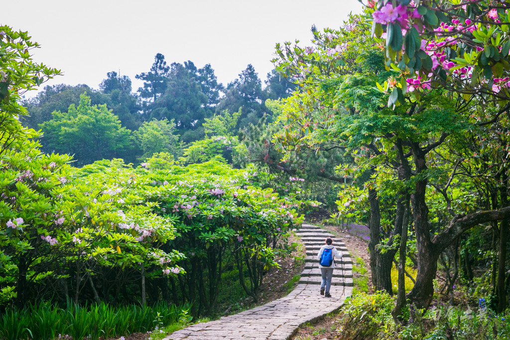 往归云亭的方向是一个山坡,两侧杜鹃花夹道一条石板路拾级而上,徐霞客首游天台山的行程第一站便是登顶华顶山,《游天台山日记》被置于《徐霞客游记》的篇首,如今森林公园内尚完整地保留着徐霞客登山古道,但是不是这一条不重要,重要的是,徐霞客没遇到杜鹃花。