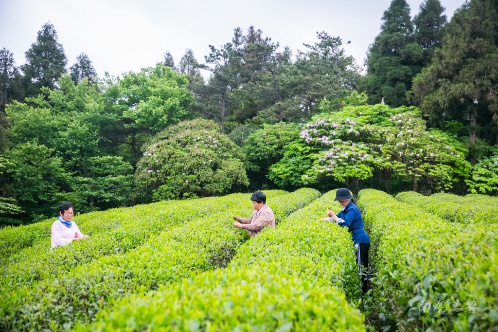 茶农在浑圆的茶树上飞快地手势,就像在古琴上弹奏着一曲《阳春白雪》,余音缭绕山谷。