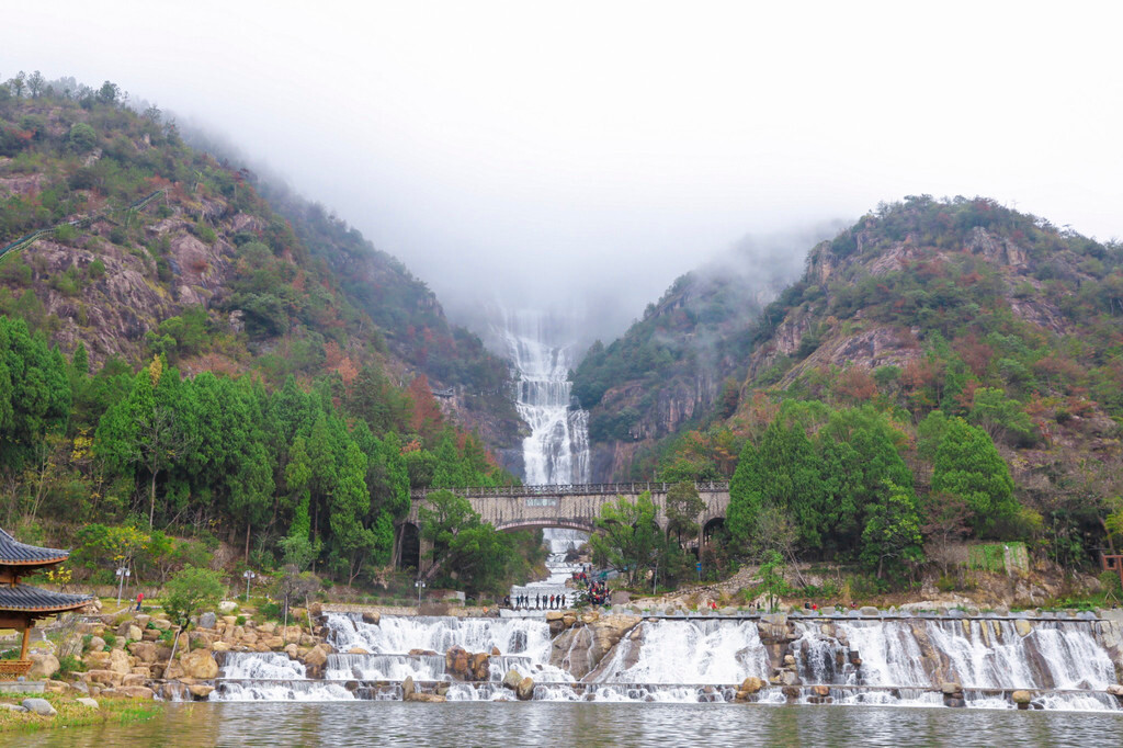 天台 山大瀑布在云雾中若隐若现,仙气缭绕