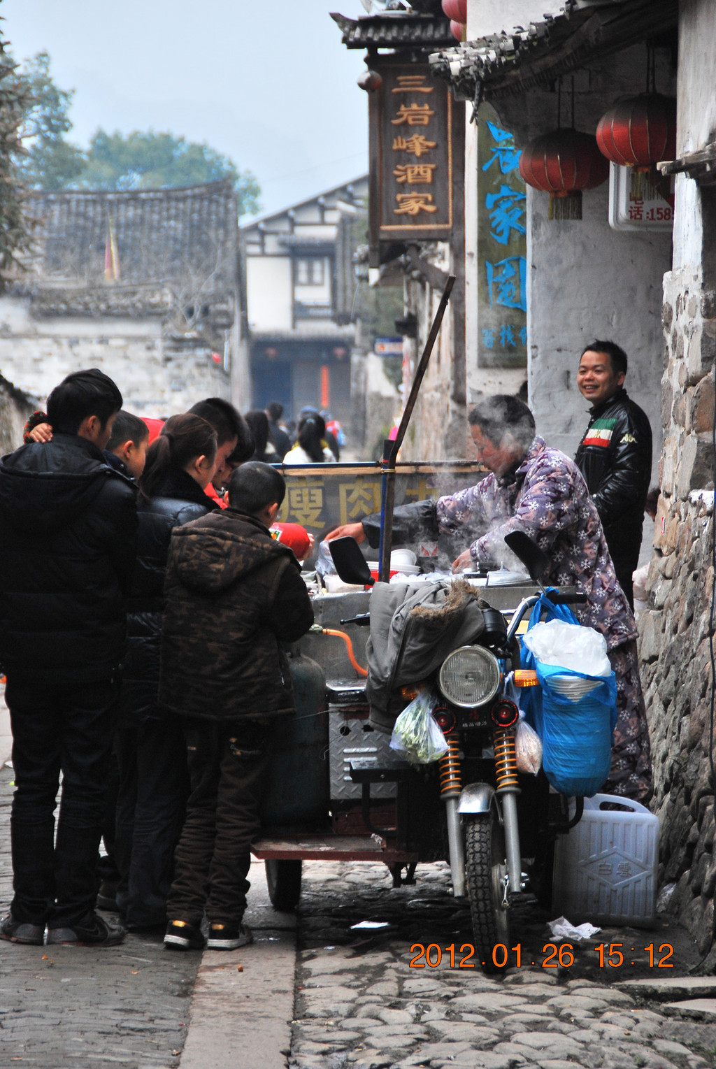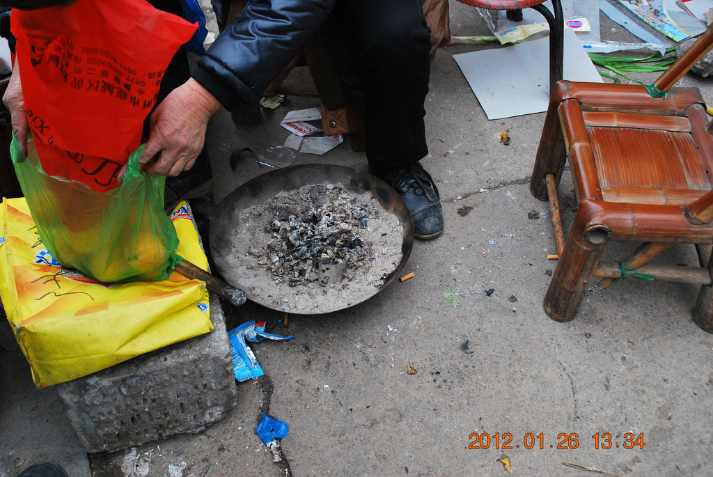 永嘉的气温略高于上海,26日为5度左右,但当地人大多围着炭盆取暖,连小商贩也是。