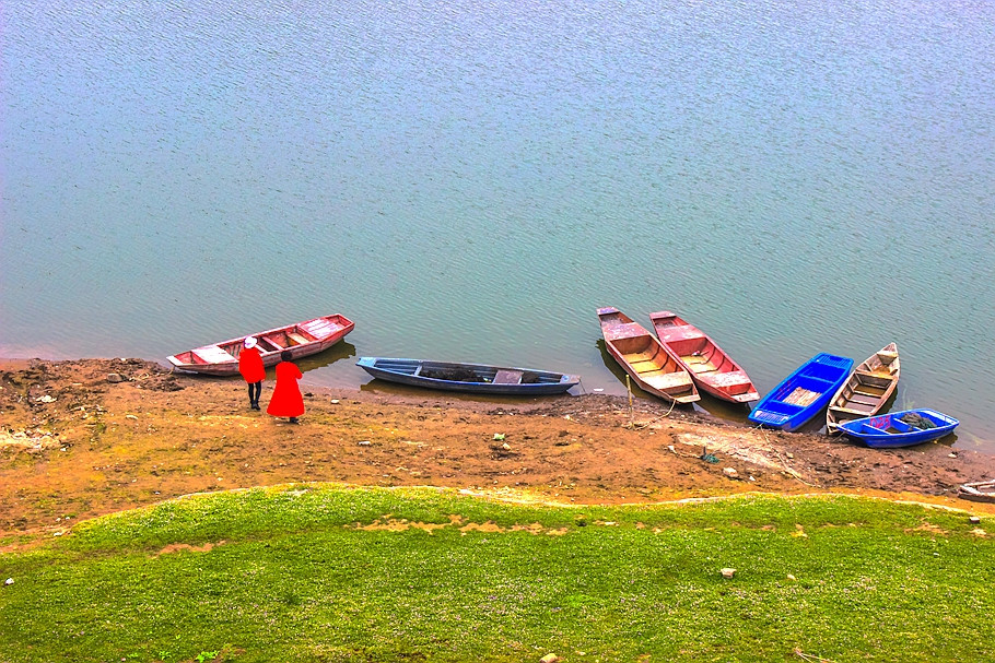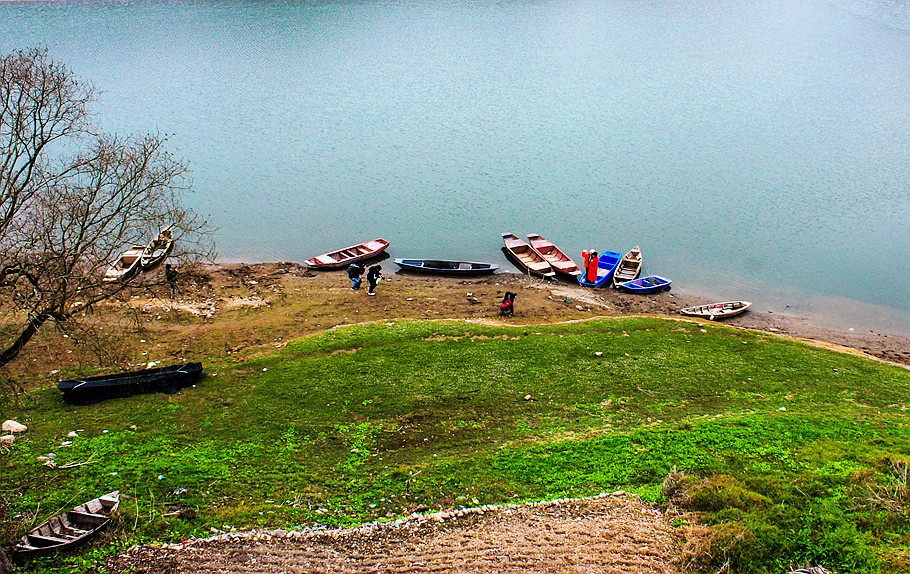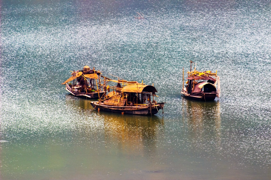 湖面上停着好几条道具渔船,大大小小形态各异。