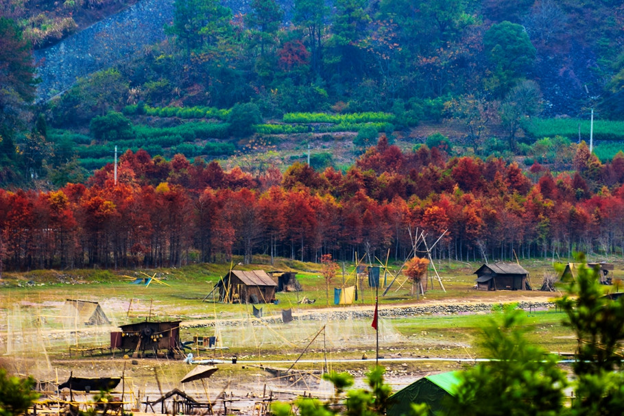 深秋,随摄影圈来到风景如画的寒山湖拍摄,由于寒山湖景区关闭。只能在寒山湖旁边的田芯村拍摄寒山湖。寒山湖其实是一座位于半山腰的水库,深秋的寒山湖层林尽染,除了绿色,还有橙黄、明黄、火红、像是打翻了调料盘,美的让人不忍错目。
