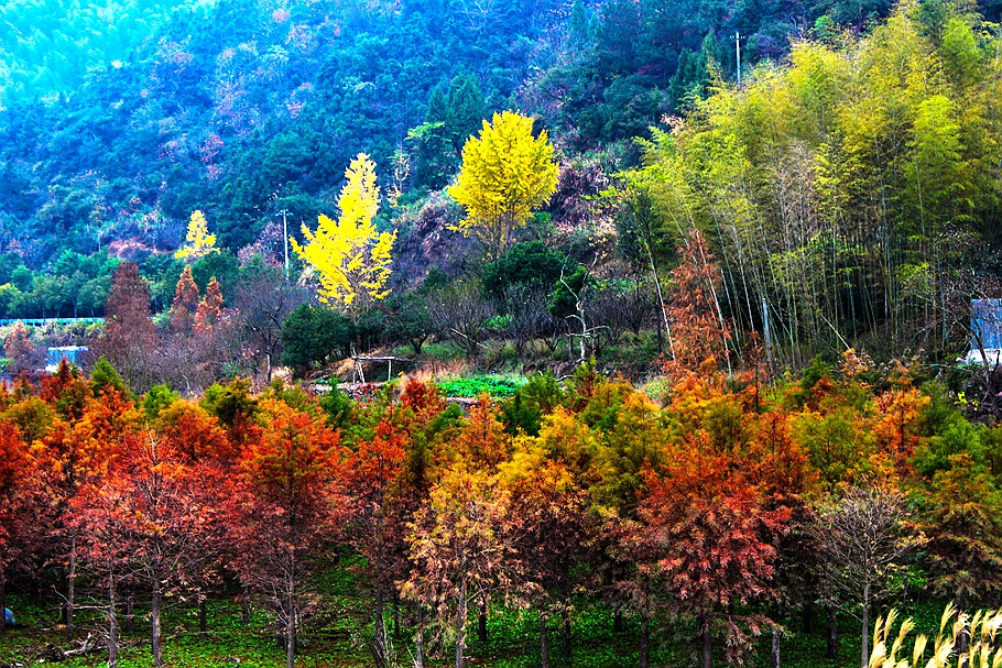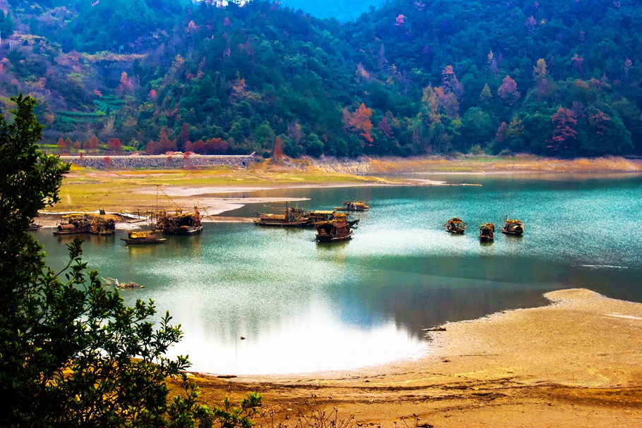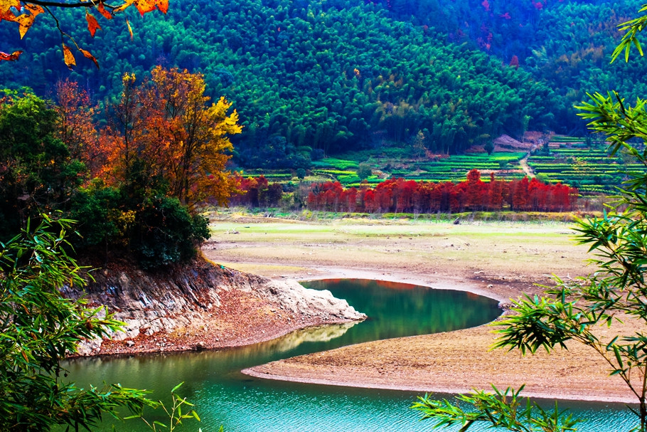 远处青山如黛,近处湖水如兰,红杉林立,黄沙铺垫,再加上其间依旧翠绿的松柏,这怕是这个初冬最耀眼的调色盘了吧。