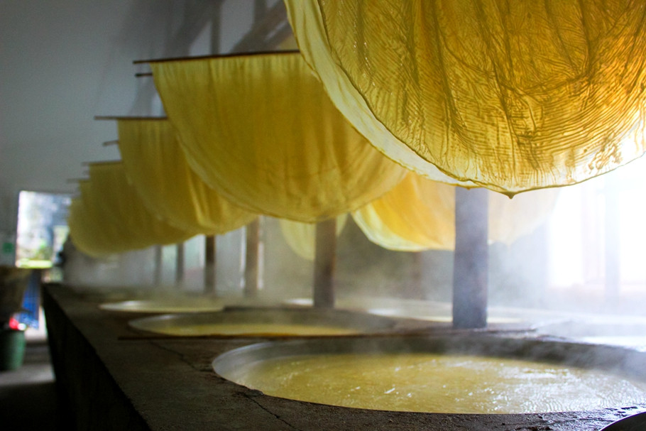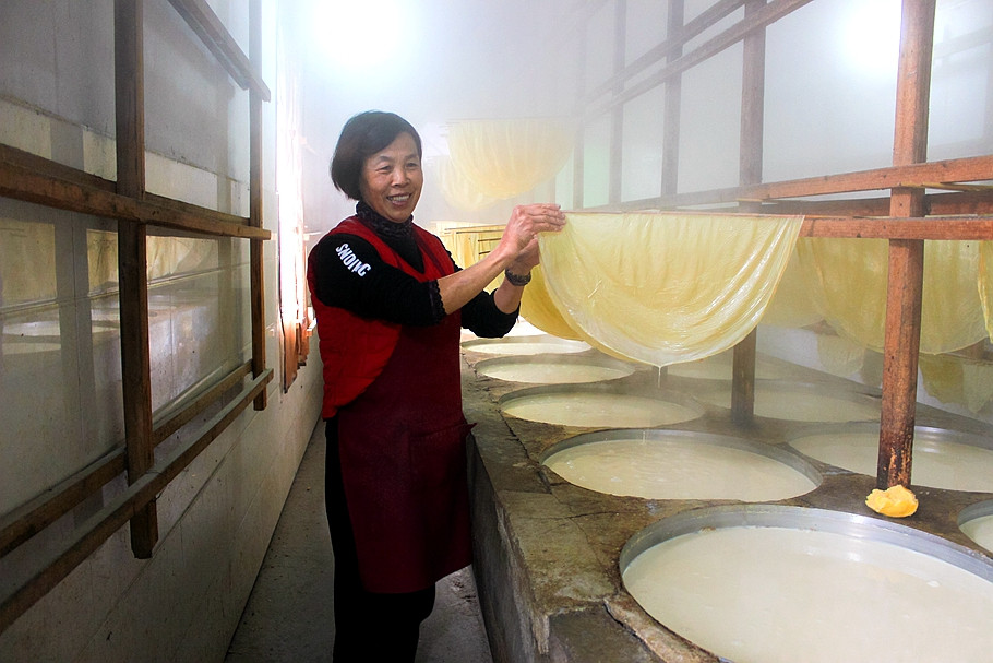 村里有一个豆腐皮作坊,这位热情好客的老板娘,已经做了20多年的豆腐皮。那种薄如蝉翼般的豆腐皮,至今是此村的一个创收“保留产业”。