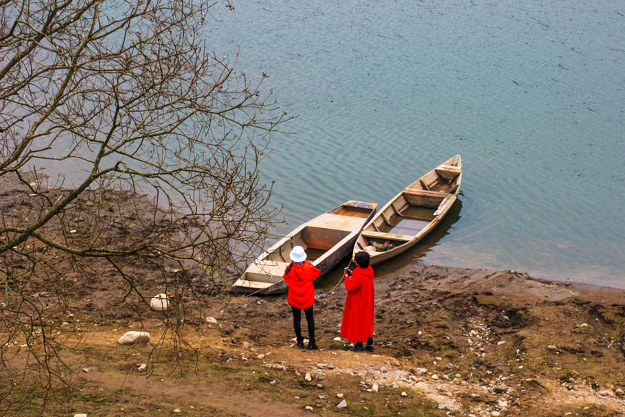 田芯村是个世外桃源,这么美的景色,自然会被影视剧选为拍摄现场。刚巧,湖边有一支摄影组,正在拍摄电影,湖中有渔船,湖边有茅房;旁边的山体景色也错落有致,勾勒出了这一幅“寒山湖渔村”的景象。
