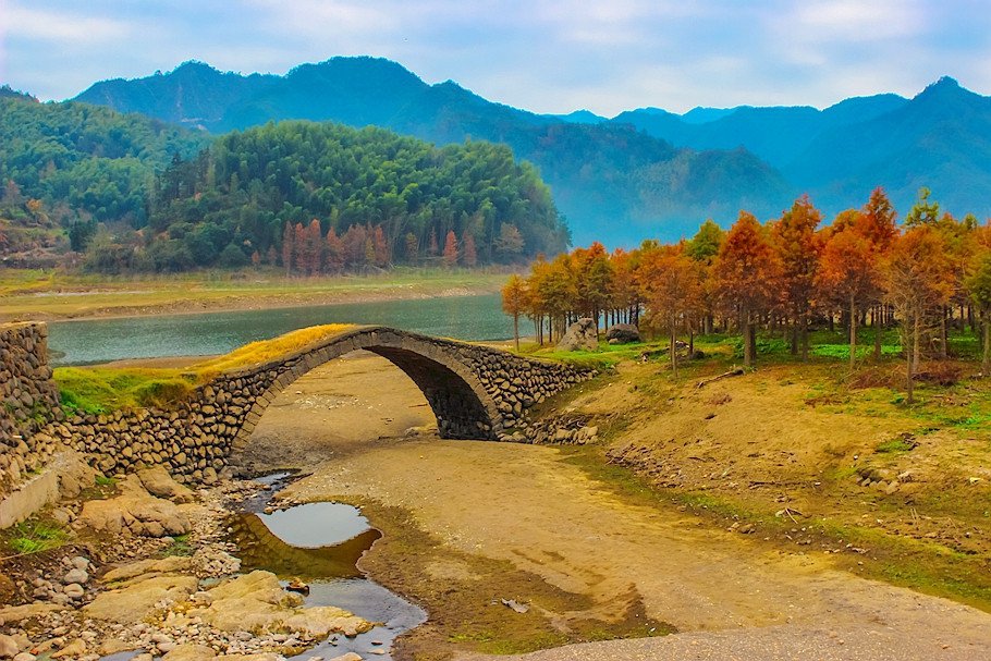 田芯村村口紧挨着62省道,是一个三面临湖,一面靠山的小村,风光秀丽。站在村口的62省道大桥上,眺望秀丽的寒山湖。冬天,寒山湖水位低,小溪露出干枯的河床。如果小溪里涨满了水,那画面中的鹅卵石古桥在溪水的倒影下,更加漂亮。