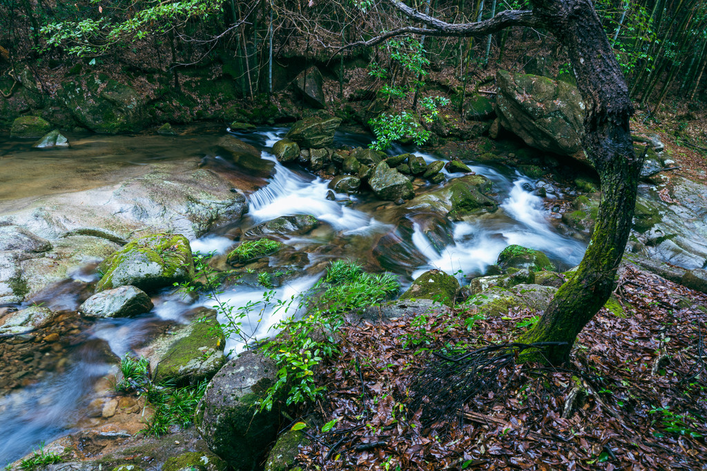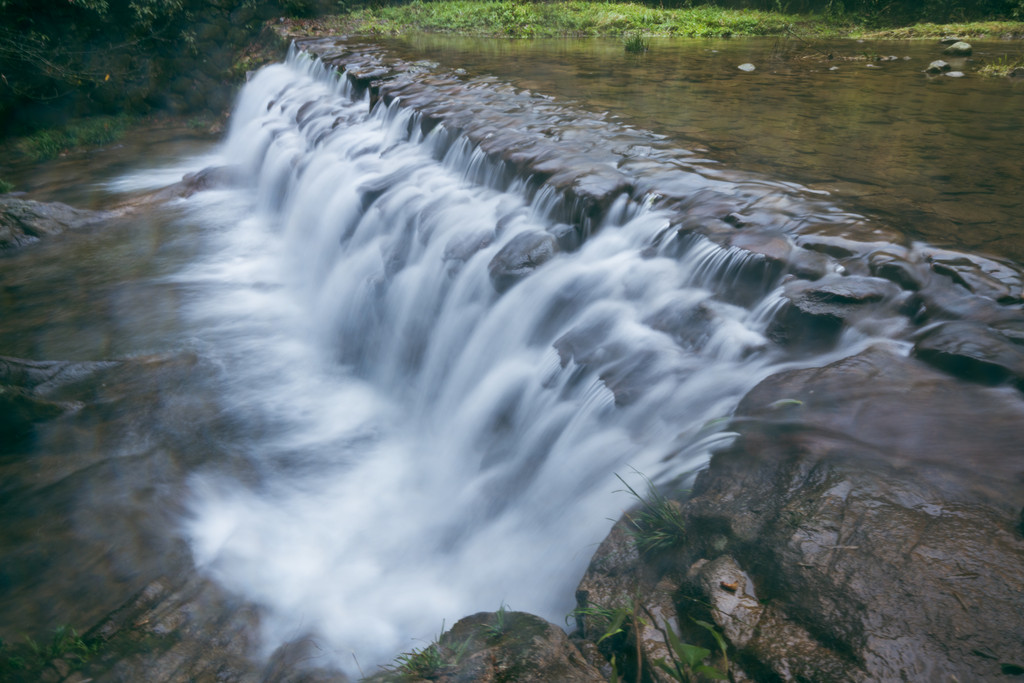 金溪和大兴坑两条溪水,相约于此,。岩石叠起,溪水流经于此,折跌急促向下。溪流在阵阵白浪之中流到了石梁附近,形成巨大的水流,向石梁冲激过来,而石梁则似保护了溪流千万年。