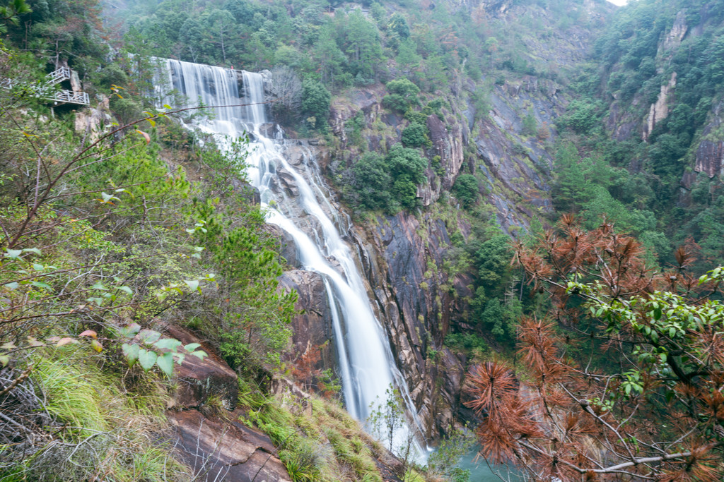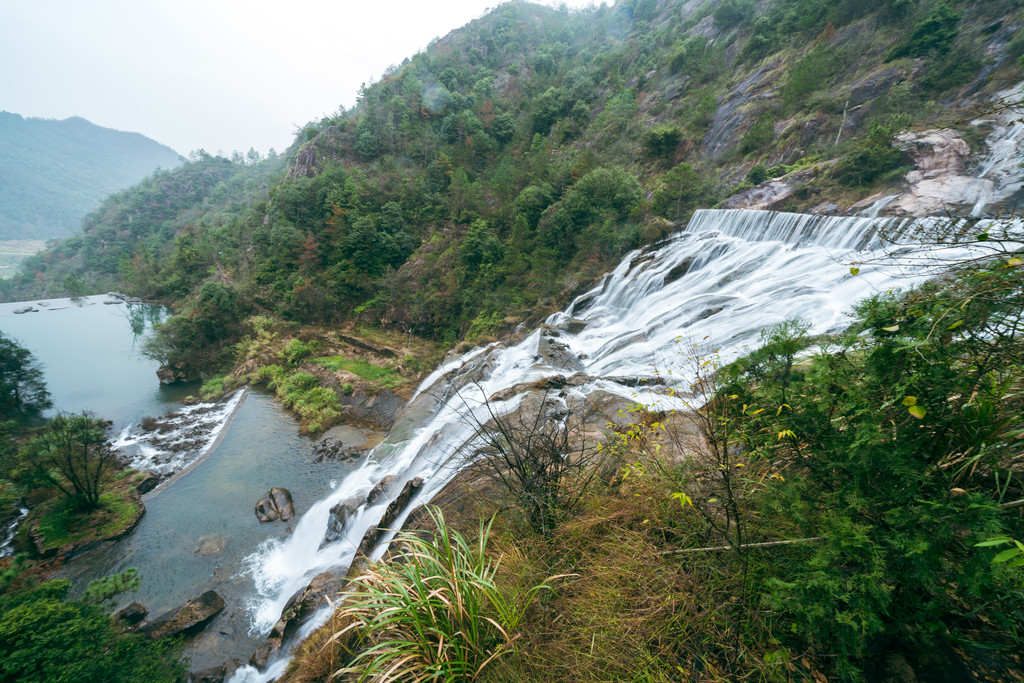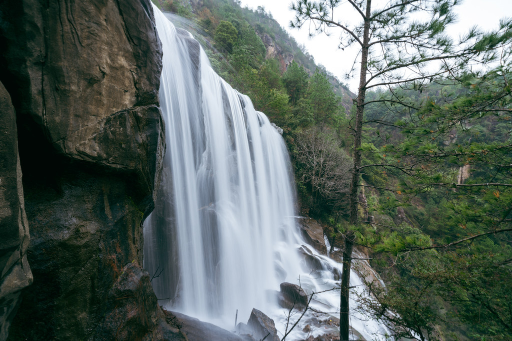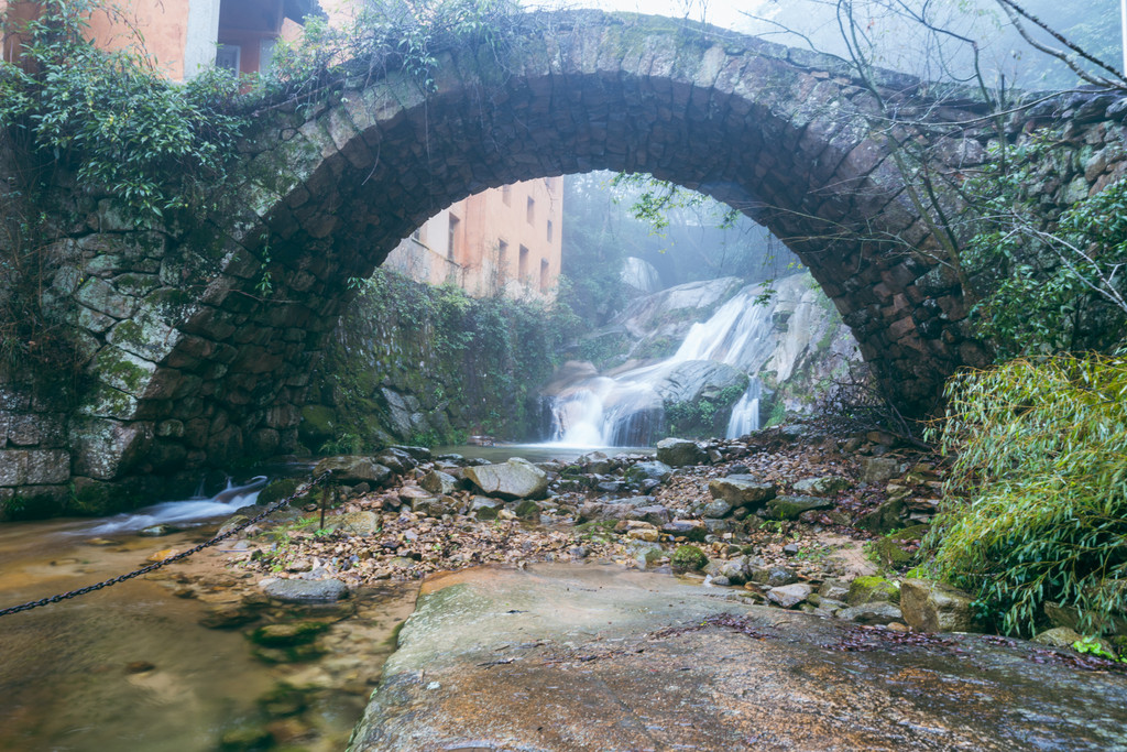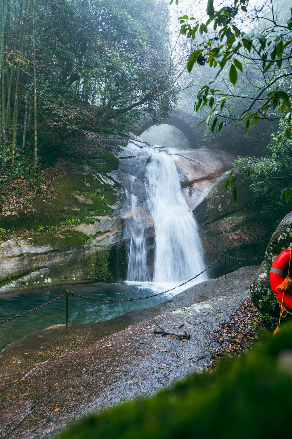 石梁飞瀑非长而曲折,非一泄千里,称之为石梁,故名思义,它的独特之出是有一条二丈左右的巨大石梁,横跨在两崖之间,像是人意而为之,却是天然形成,拱起的梁面,像纵容着瀑布从下穿越奔腾。