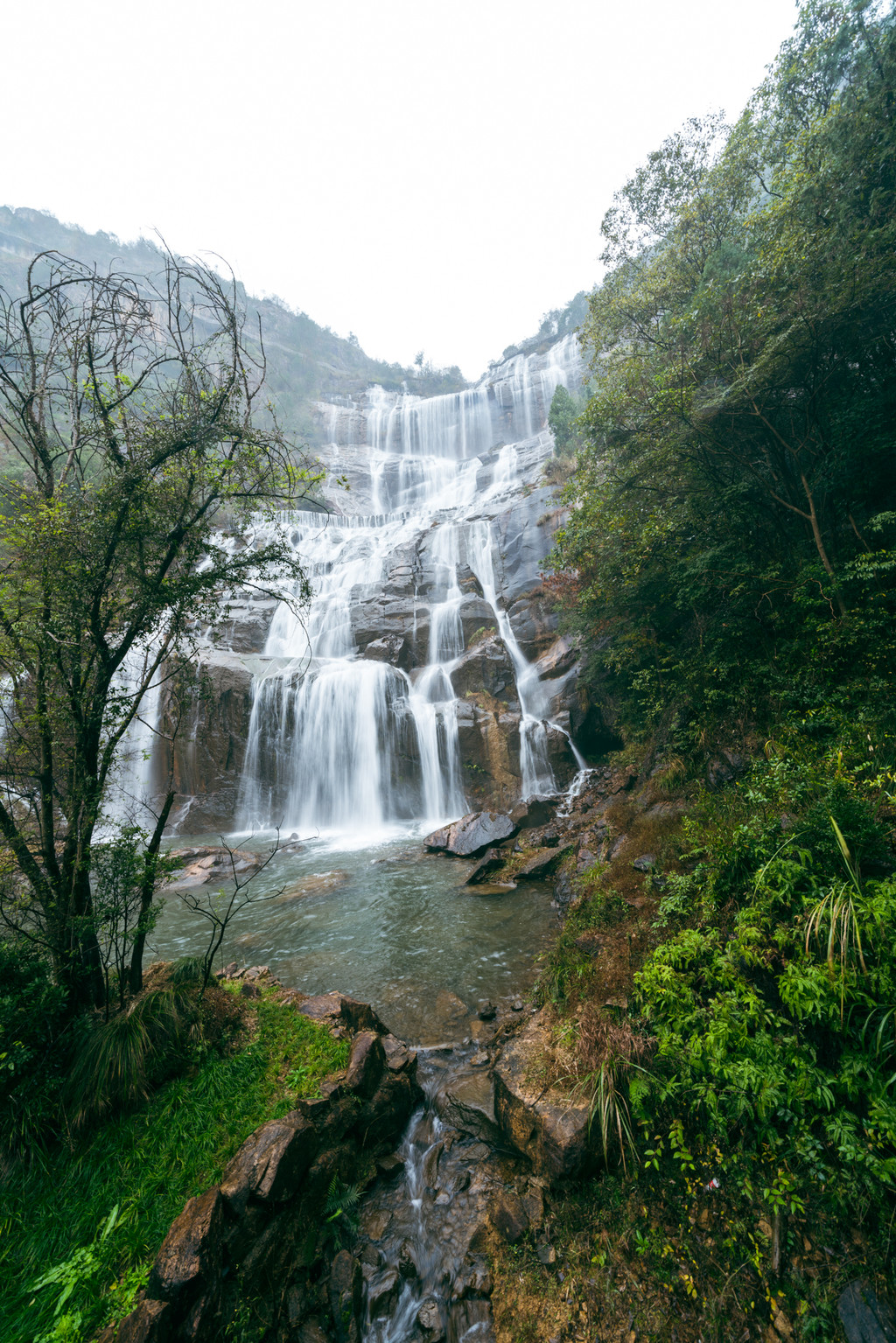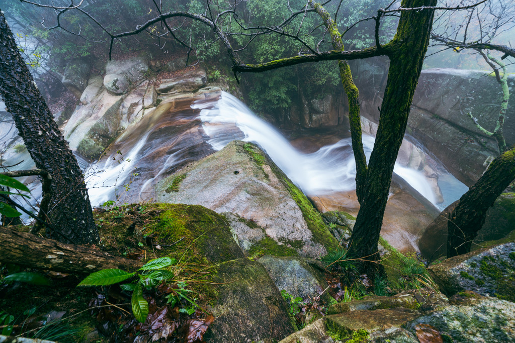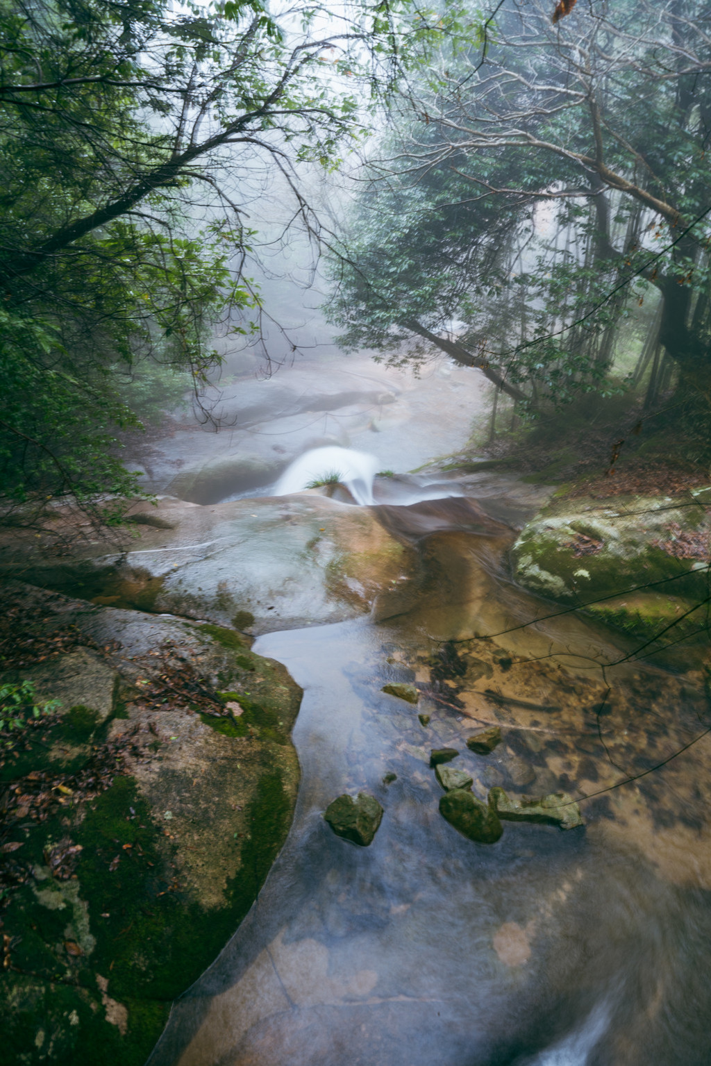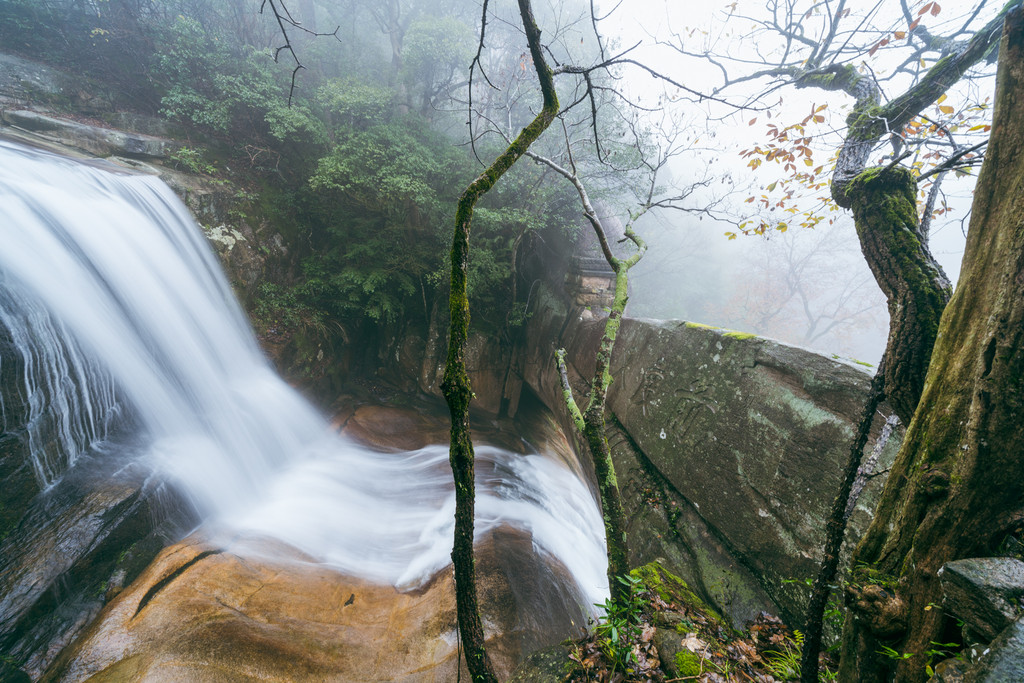 石梁飞瀑非长而曲折,非一泄千里,称之为石梁,故名思义,它的独特之出是有一条二丈左右的巨大石梁,横跨在两崖之间,像是人意而为之,却是天然形成,拱起的梁面,像纵容着瀑布从下穿越奔腾。