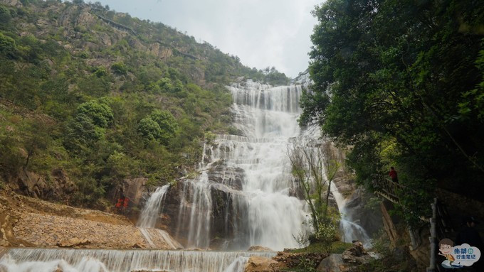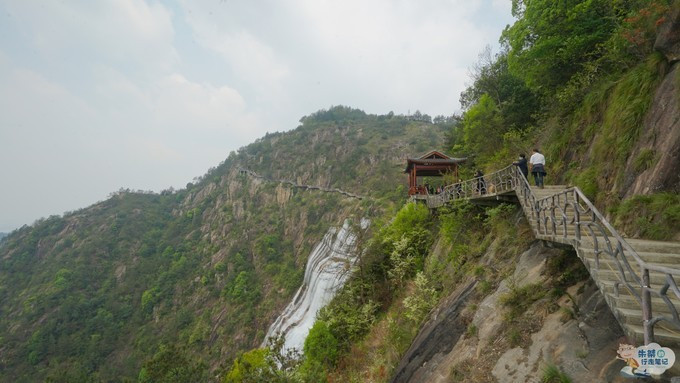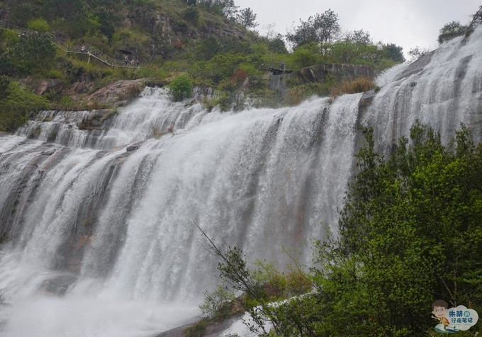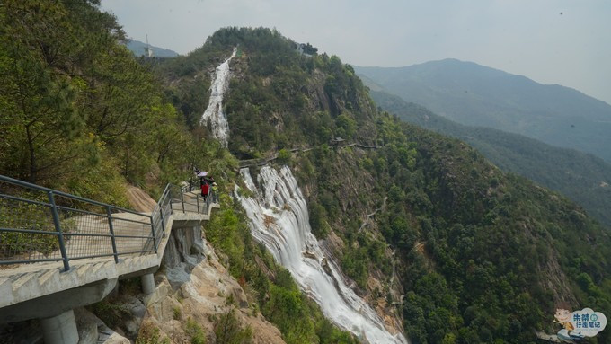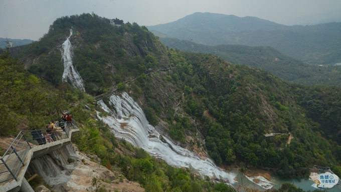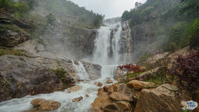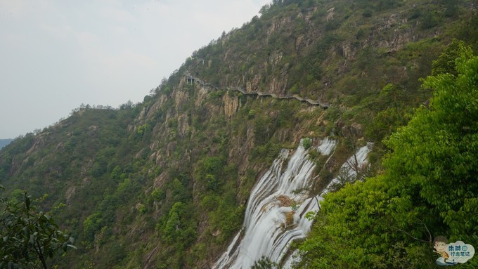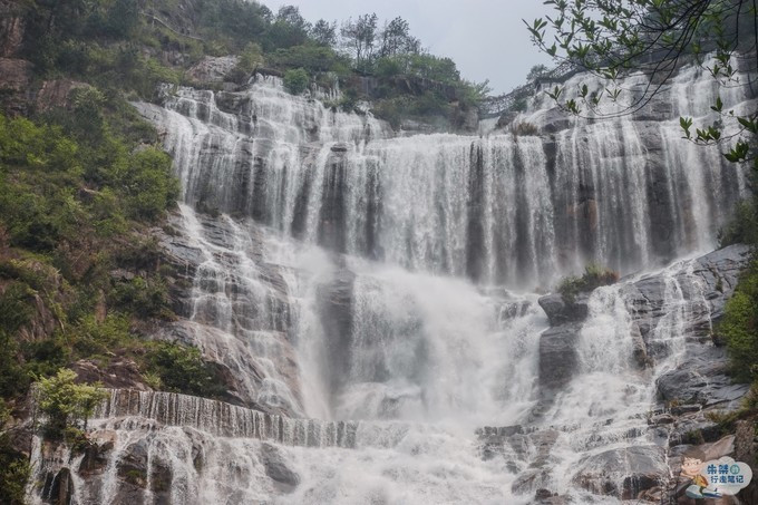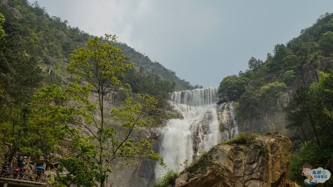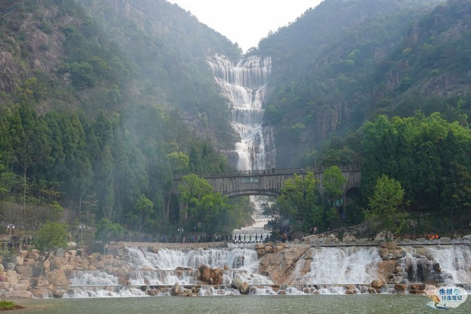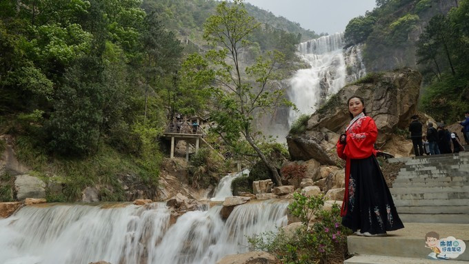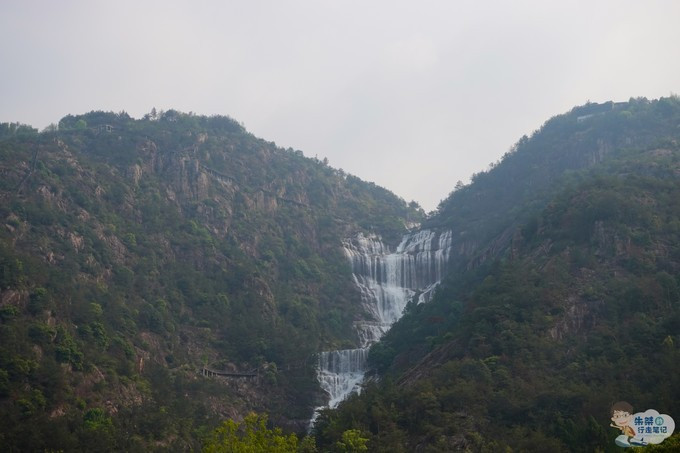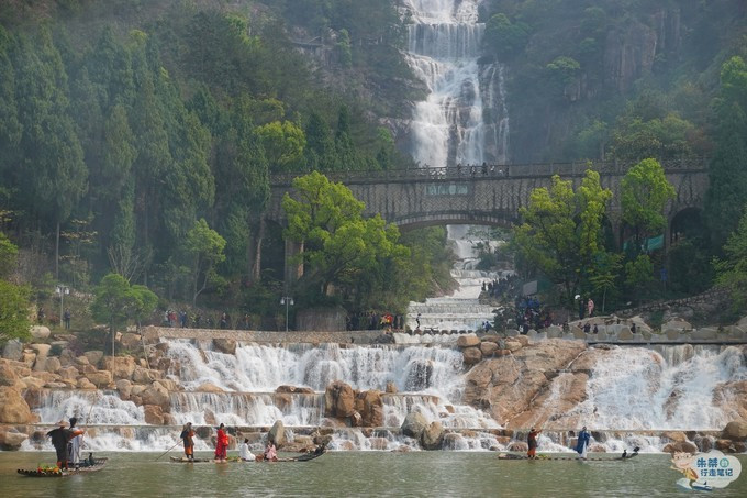 恰逢春意时节,一早云散晴朗,山光正好。这次的试运营从4月12日持续到4月30日。五一前,大瀑布景区实行限流预约体验制度,可以通过“天台山旅游网”预约免费体验券进入景区游览,每天限流500人。第一天便人头攒动,还没抵达我已隐约听到有种似排山倒海、万钧雷霆的声音在方圆数公里的空中轰鸣着,此时,我跳动的心随着愈来愈近的瀑布声也剧烈激荡起来。只见9级梯级瀑布群宛如一条白色玉带,倾泻于群山玉潭中。