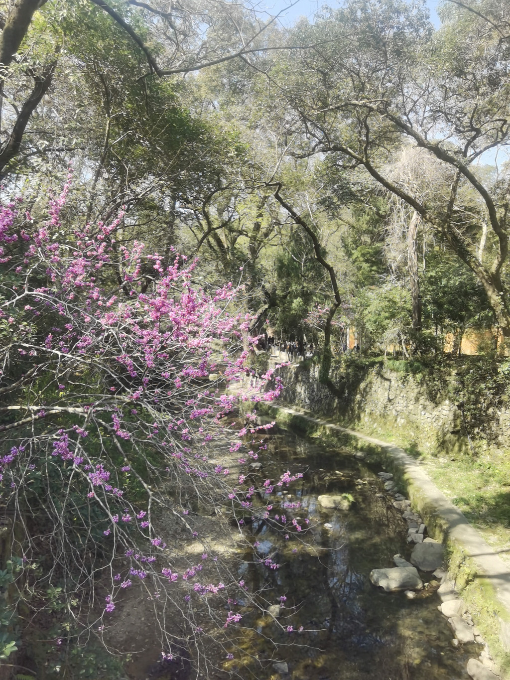 通往国清寺的这条路好美啊,参天的松柏,粉色的紫荆,阳光从树缝中洒下来斑斑驳驳非常漂亮!还没停下车,我就已经被这里古幽清雅的气质所吸引