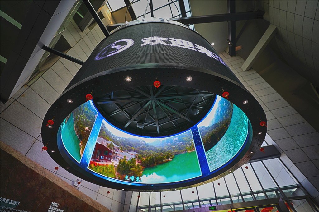 刚步入大厅,即会看到一座多媒体双面环形屏幕,内屏不断地滚动着关于天柱山的风景图,将雄奇灵秀的自然风光展现得淋漓尽致。