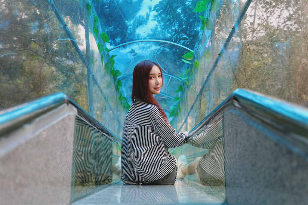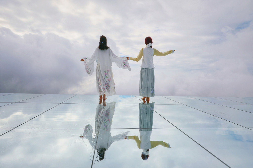 为达到更加立体的效果,两侧又加上了立面镜,形成合围之势。当你站上去后,可发现左右及脚底有三个相同的自己,再加上蓝天白云的映衬,极富诗情画意。
