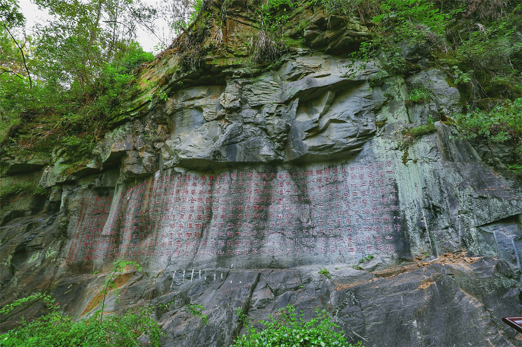 在三祖寺的旁侧,有一条游步道直通景区,走在这条游步道上,很快就能看到一块非常醒目的石壁,上面镌刻着“山谷流泉摩崖石刻”八个大字,蔚为壮观。