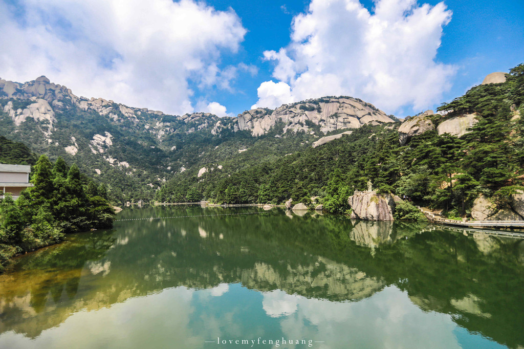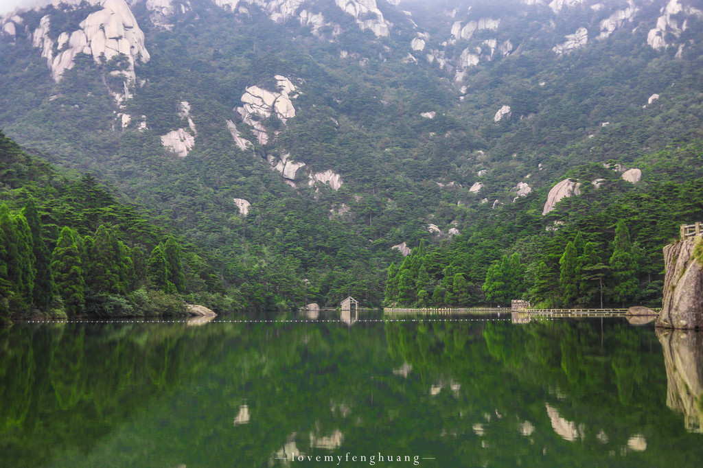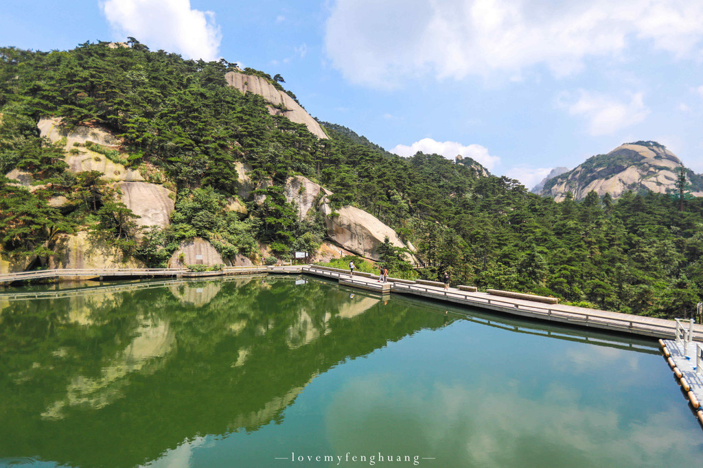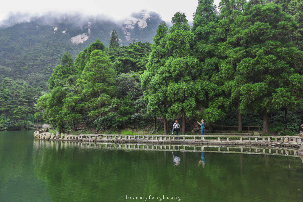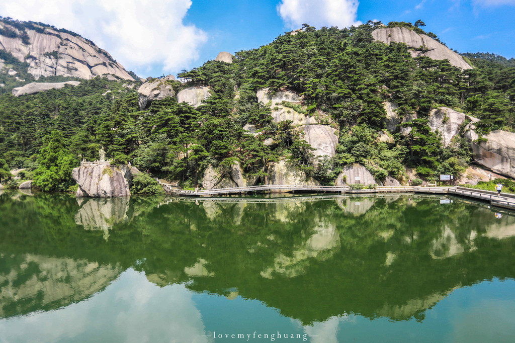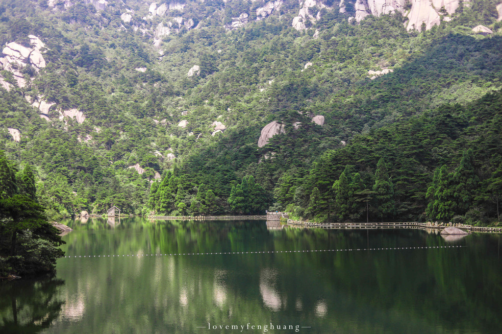 清晨来到炼丹湖,置身湖畔,举目四望,苍崖青松倒影其中,如锦如织,给这平静的水面增添了生机,微风徐来,湖水荡漾,波光粼粼,又是一番景象,泛舟其上,如入瑶池,不愧是安徽天柱山的人间仙境,为国内第三大高山人工湖,能够媲美新疆“天池”和长白山“天山”。
