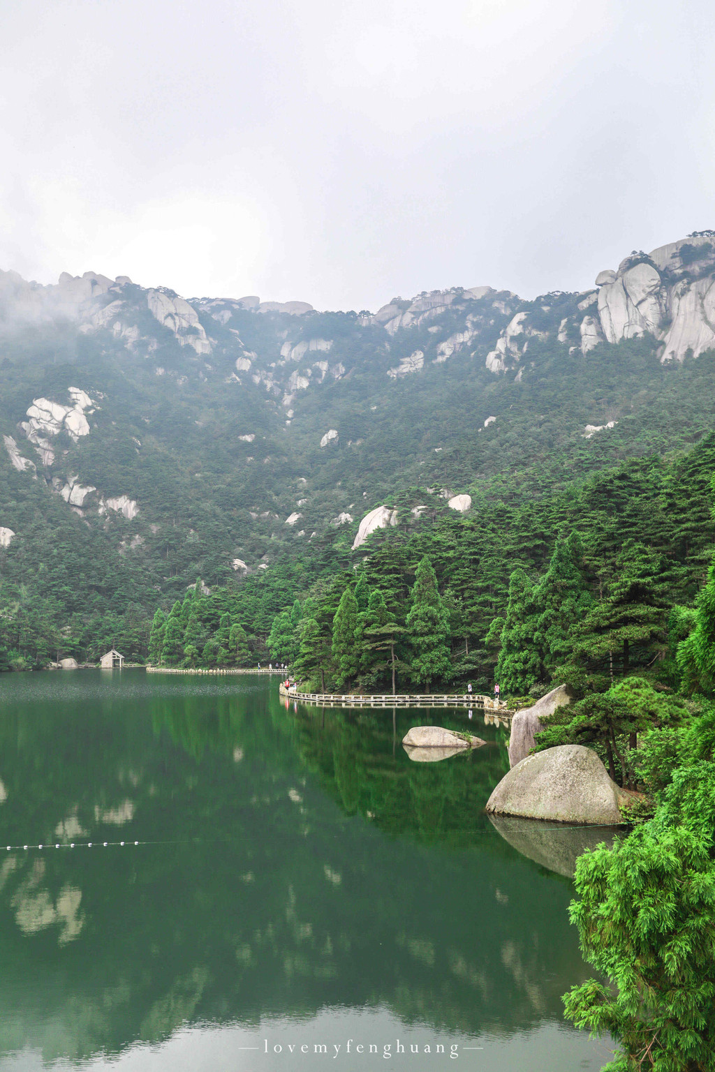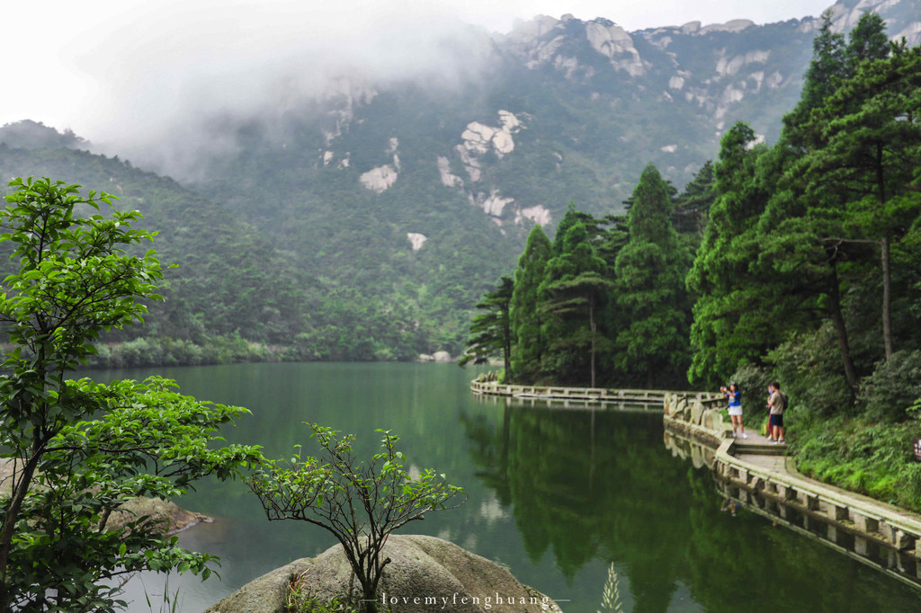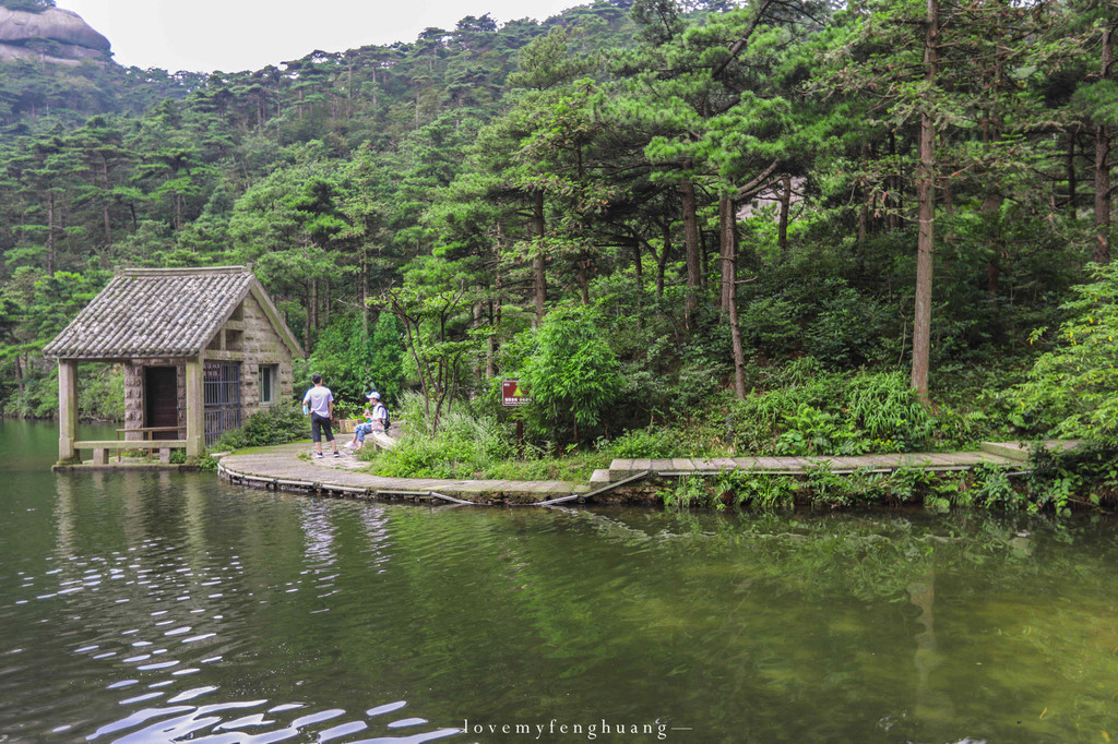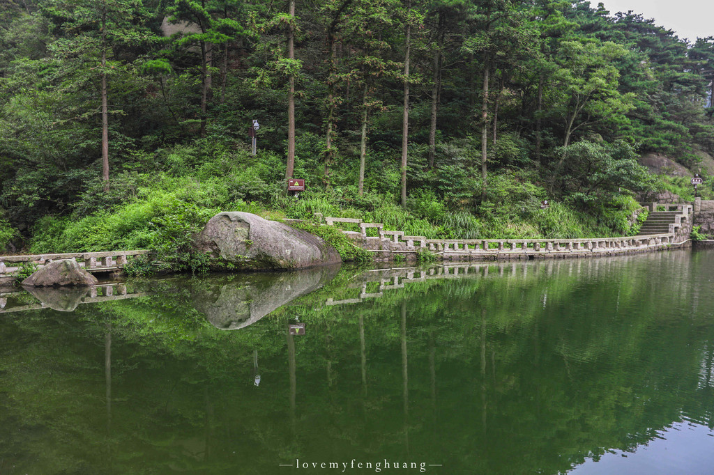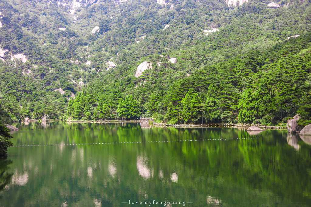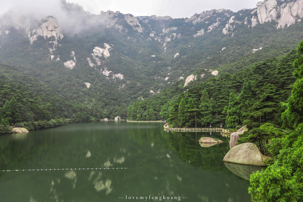 清晨来到炼丹湖,置身湖畔,举目四望,苍崖青松倒影其中,如锦如织,给这平静的水面增添了生机,微风徐来,湖水荡漾,波光粼粼,又是一番景象,泛舟其上,如入瑶池,不愧是安徽天柱山的人间仙境,为国内第三大高山人工湖,能够媲美新疆“天池”和长白山“天山”。