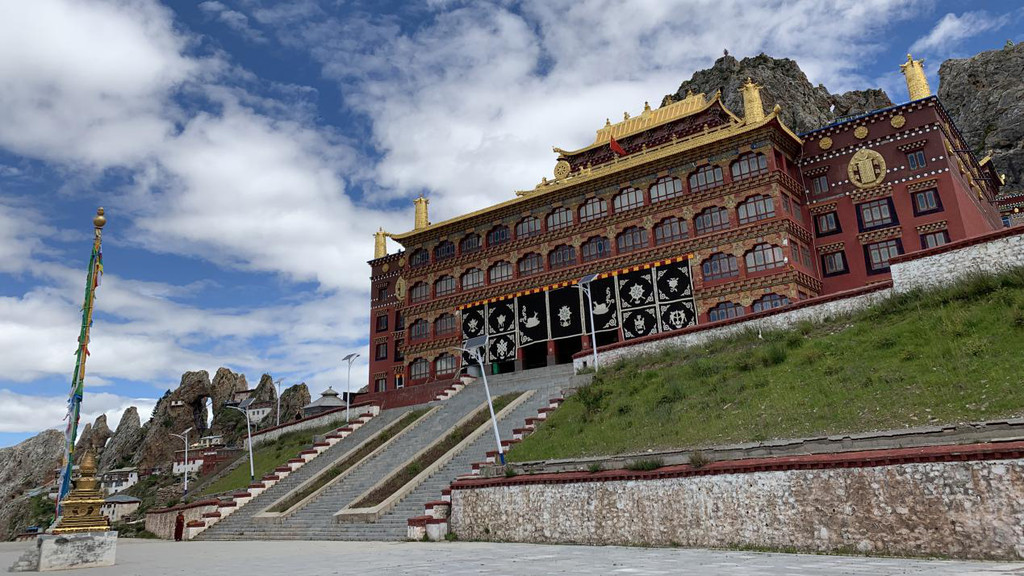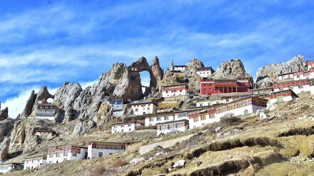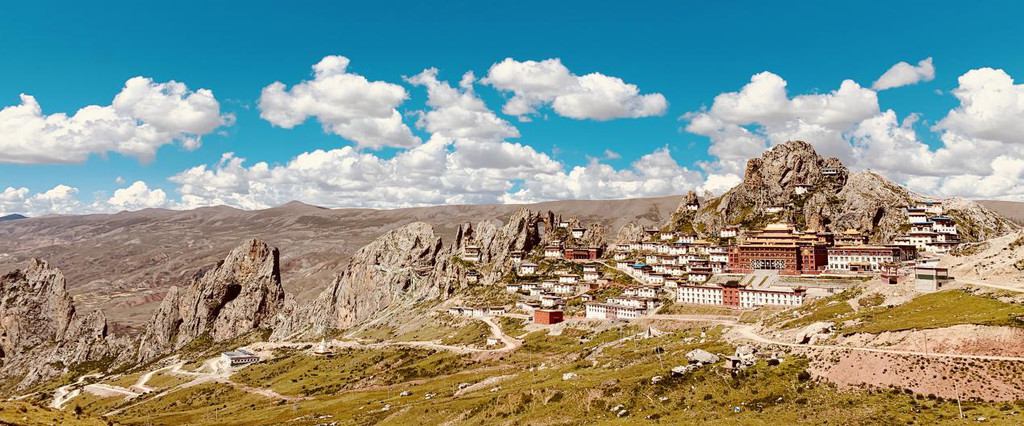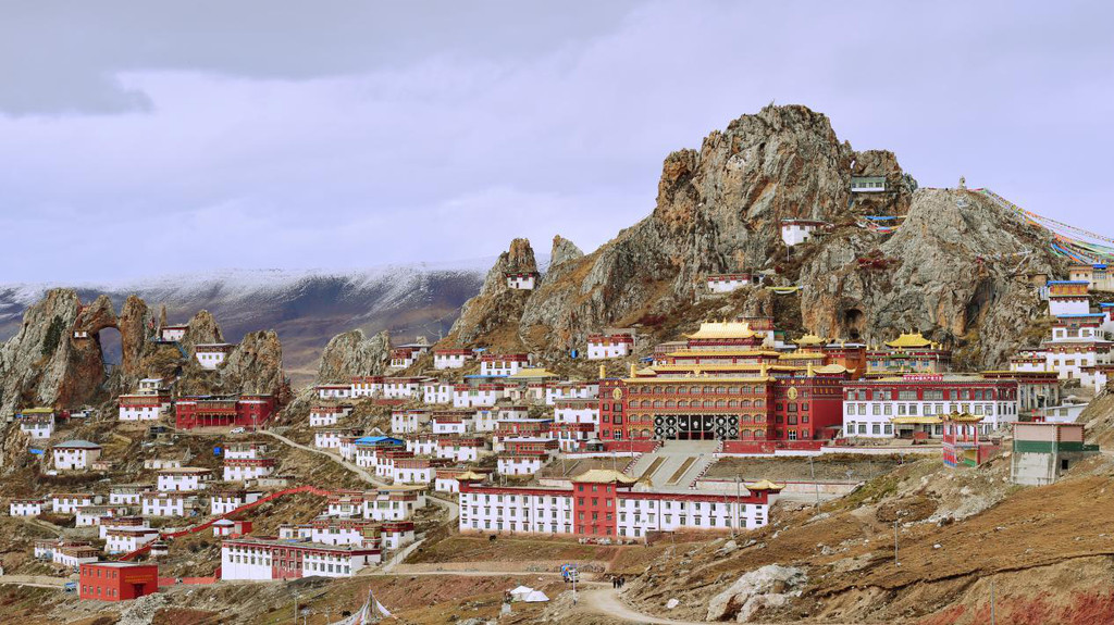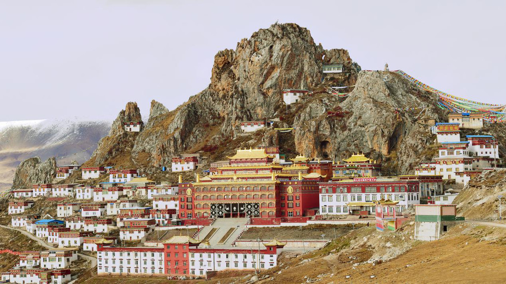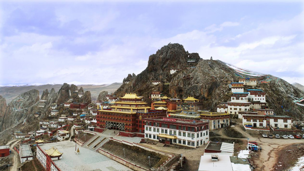 山上大殿、经堂、僧舍,依山而建,无数的修行洞分布在海拔四千五至五千米,高低错落,雄伟庄严,整体宛如一座座神圣古堡,矗立在陡峭的岩峰之巅。