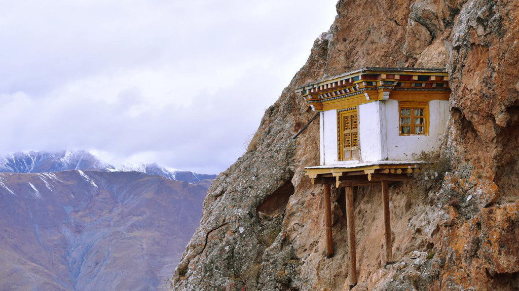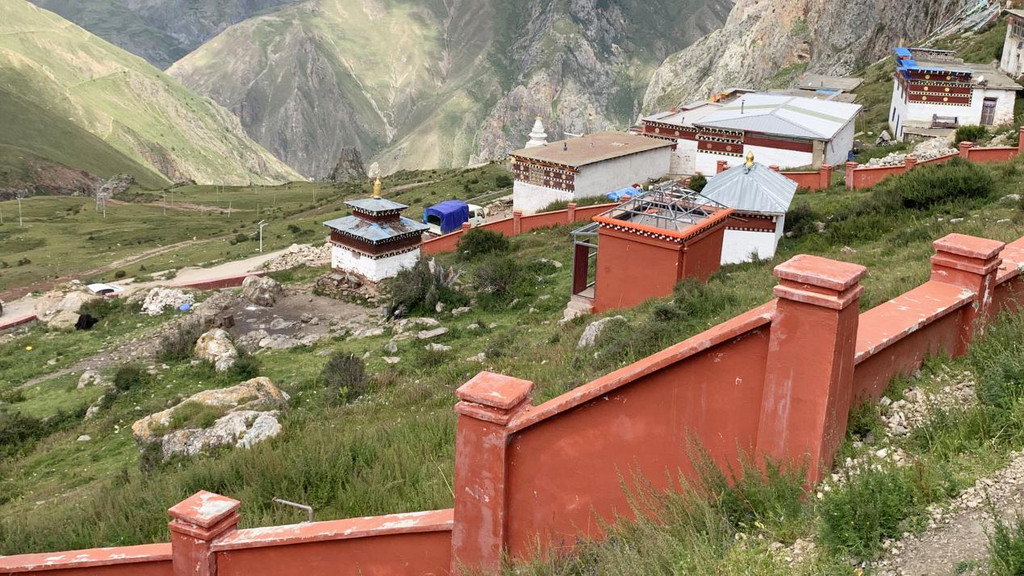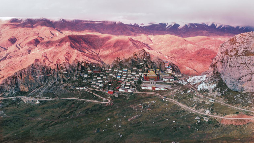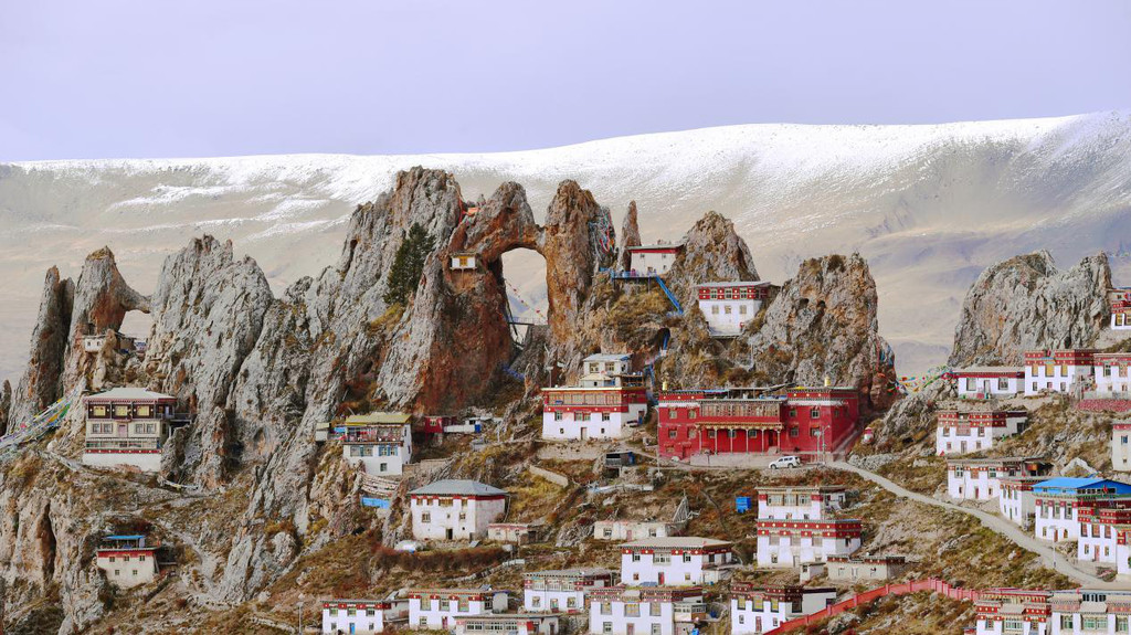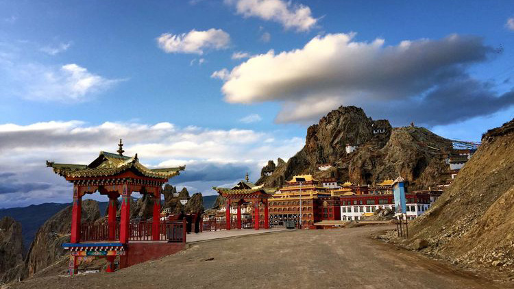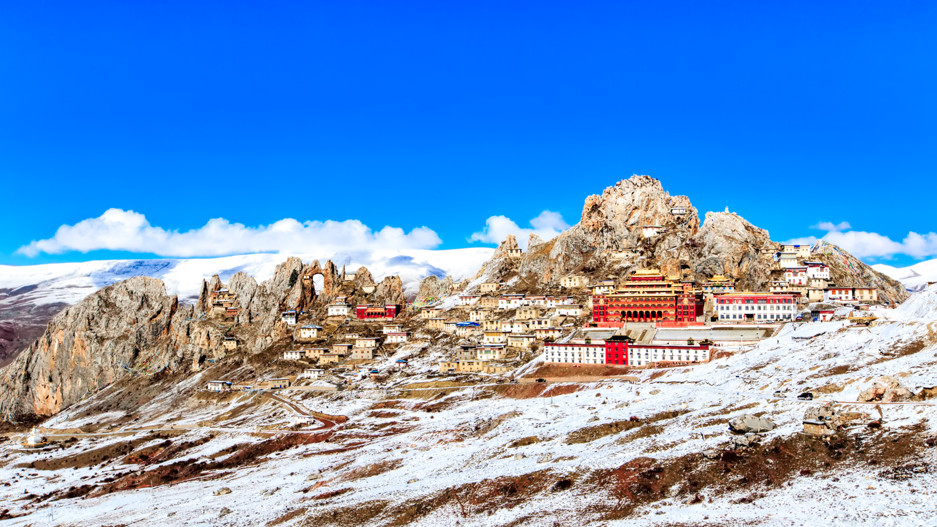 山上大殿、经堂、僧舍,依山而建,无数的修行洞分布在海拔四千五至五千米,高低错落,雄伟庄严,整体宛如一座座神圣古堡,矗立在陡峭的岩峰之巅。