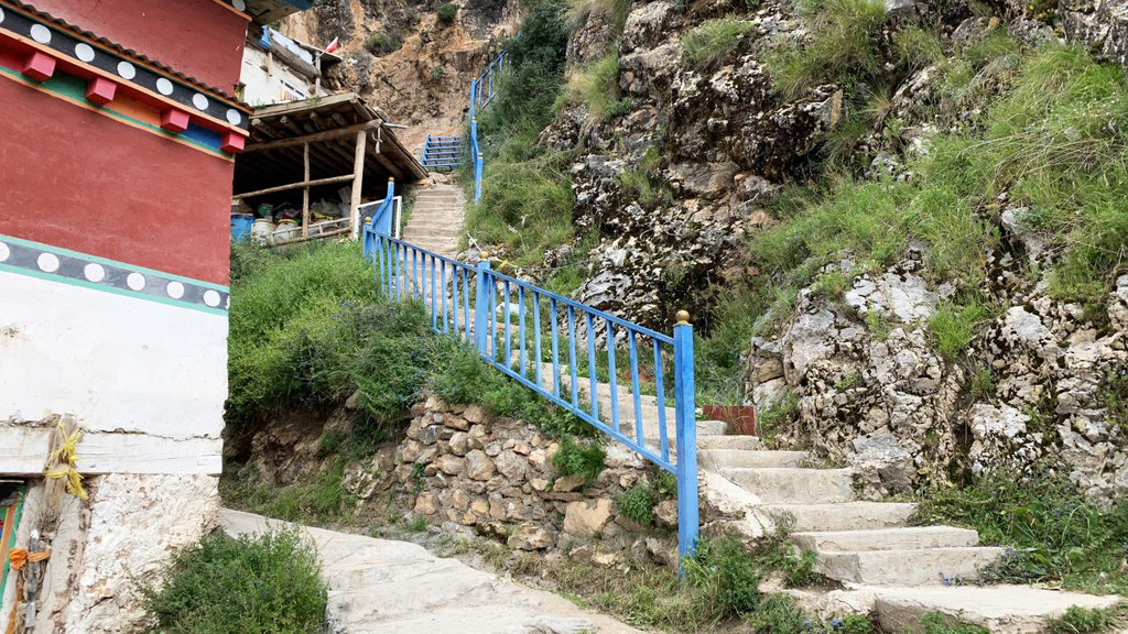 最上方有一个僧人修行的小房子,据说这里是苯教非常重要的占巴南喀大师当年修行的地方,这里还能看到当年他修行时留下的脚印。
