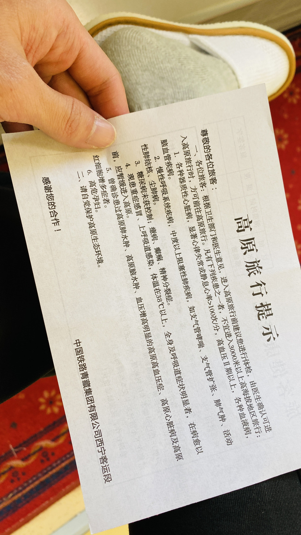 本人购买的是软卧车票(上铺),旁边的上铺是一个大哥,去拉萨工作,下铺则是两位来自沈阳的阿姨,一位61岁,一位69岁,让一直提心吊胆担心高反的我找到了一丝丝的勇气!