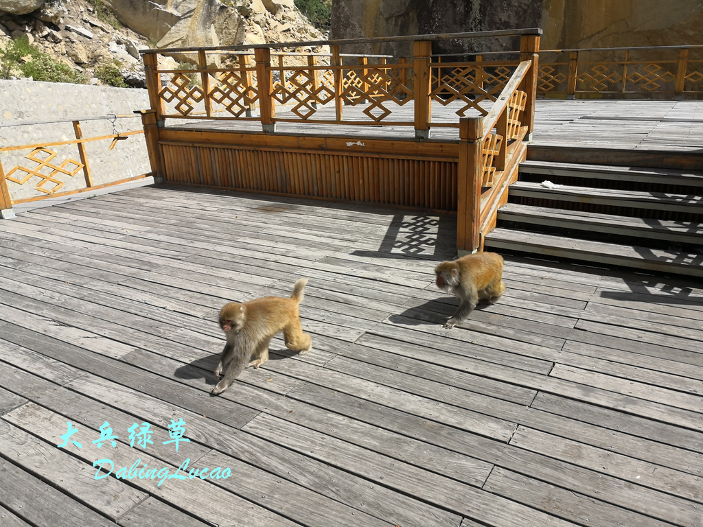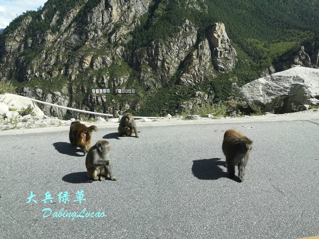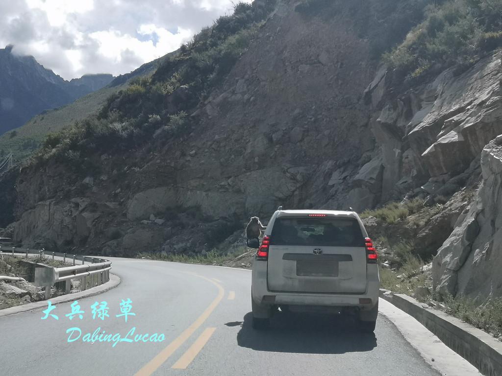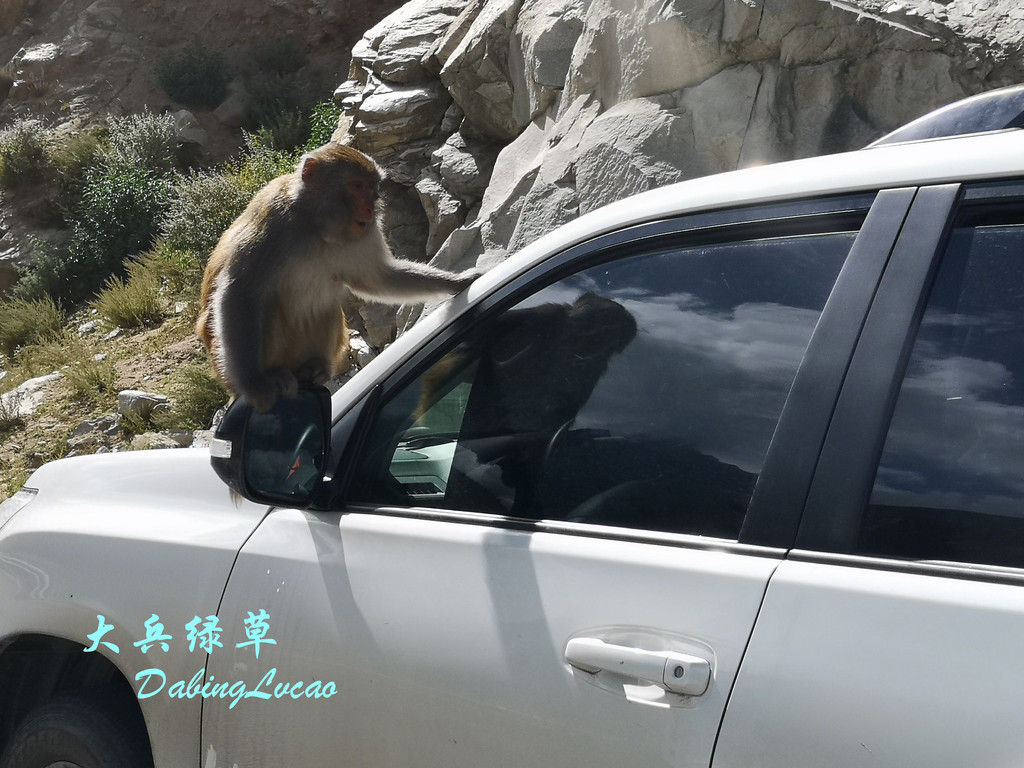 在雅鲁藏布江中游峡谷中穿行,途中还不时会遇到一些猴子,它们会在路边等候人们投食,有时还会跳到车上索要食品,这不,前面一辆车的后视镜上就坐着一只猴子。看来这里的环境保护做得不错,猴子与人的关系也是相当和谐。