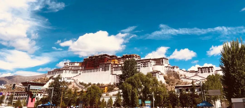 视野开阔处都能看到高大的布达拉宫,以碧蓝的天空为底色,洁白的墙体和红色的涂料勾勒出庞大的藏式建筑,光彩夺目。整座城市都臣服在布宫脚下。